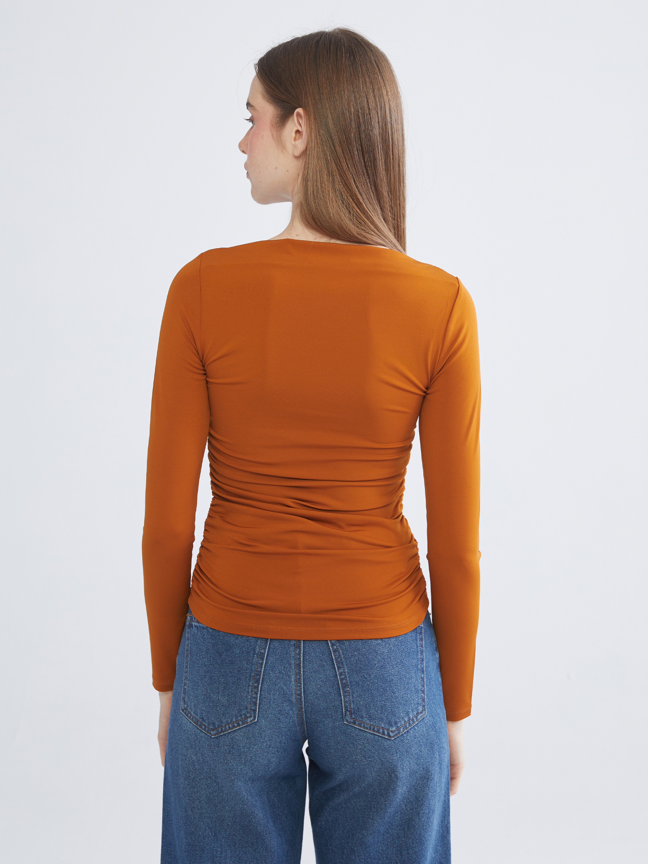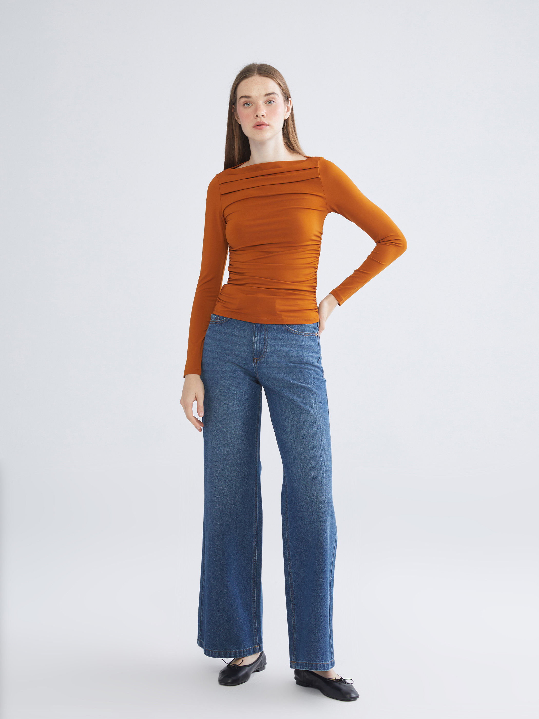 Ekstra dar kalıplı, kayık yaka kadın bluz, penye kumaştan üretilmiştir. Uzun kollu, yakası pileli ve yanları büzgülüdür.