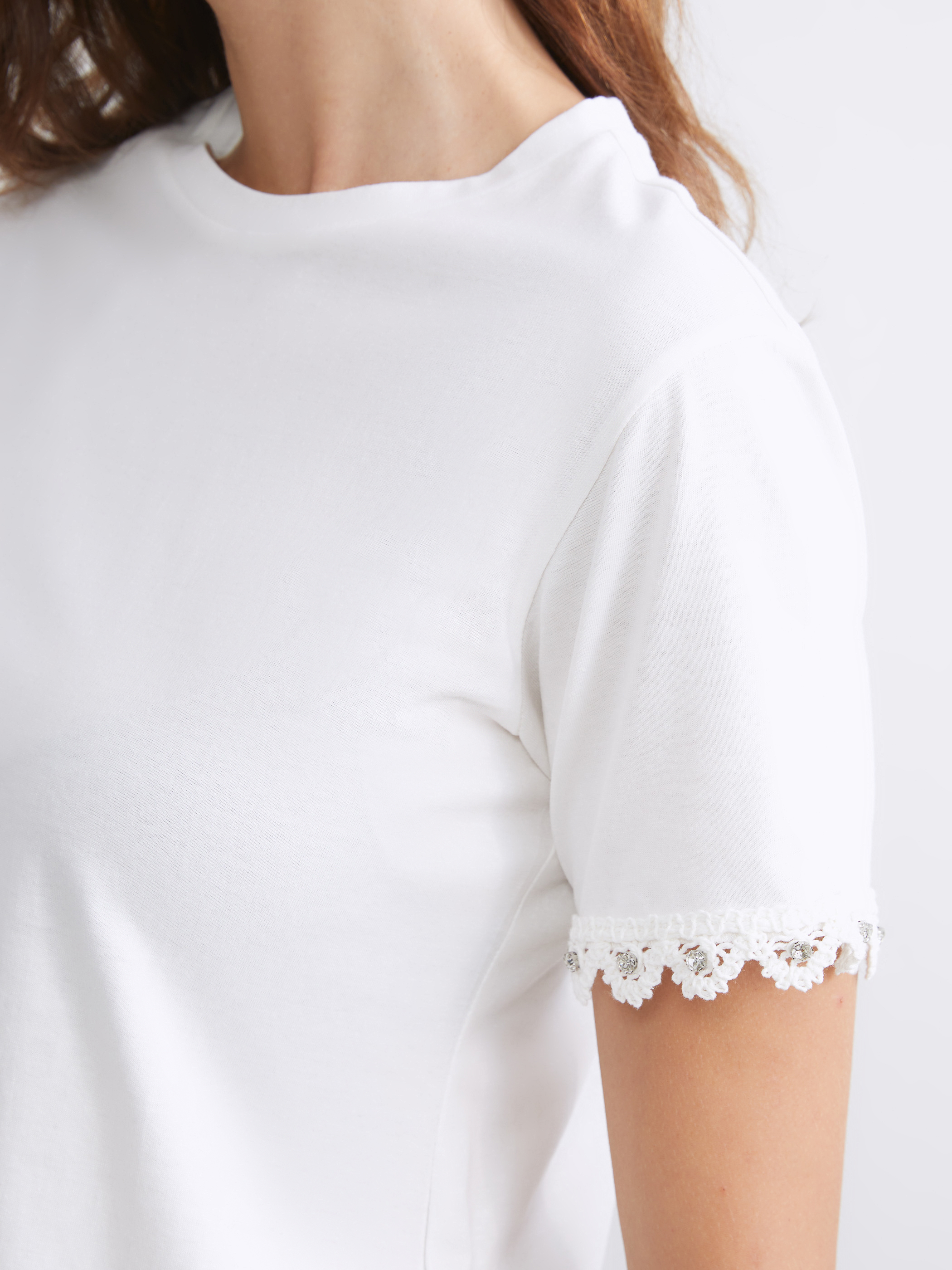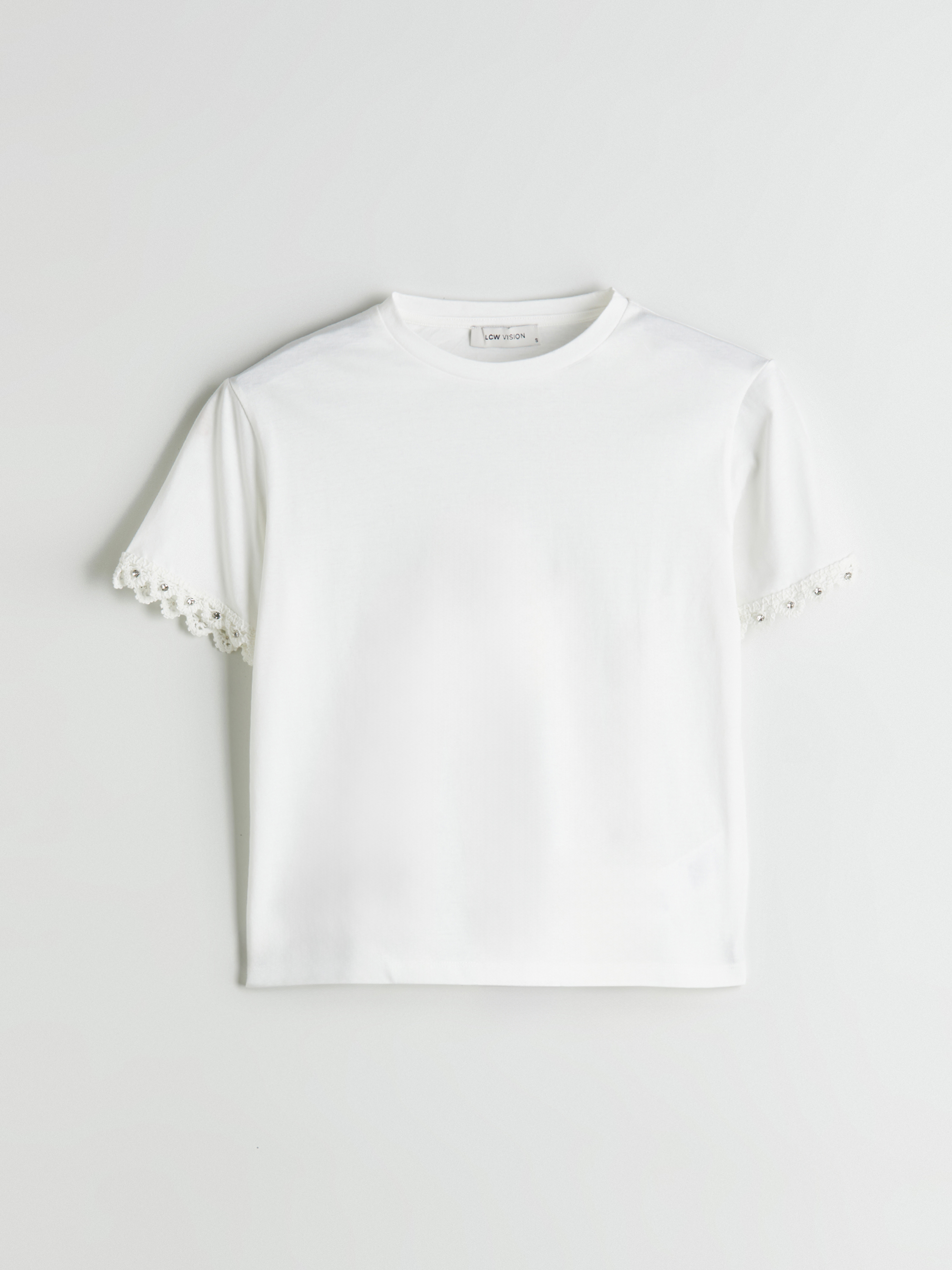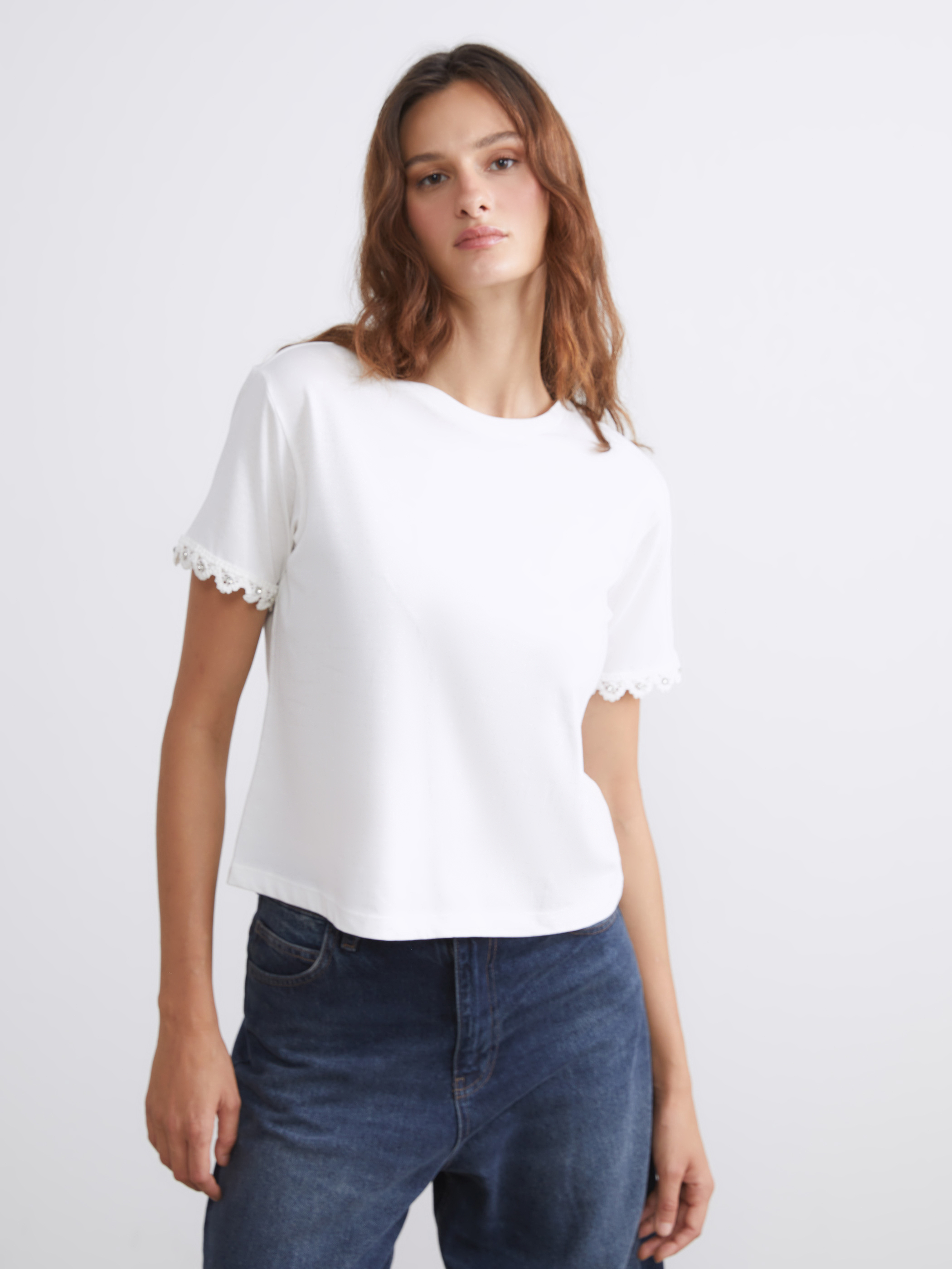 Bisiklet yaka kadın bluz, süprem kumaştan üretilmiştir. Kol uçları dantelli ve taş detaylıdır.