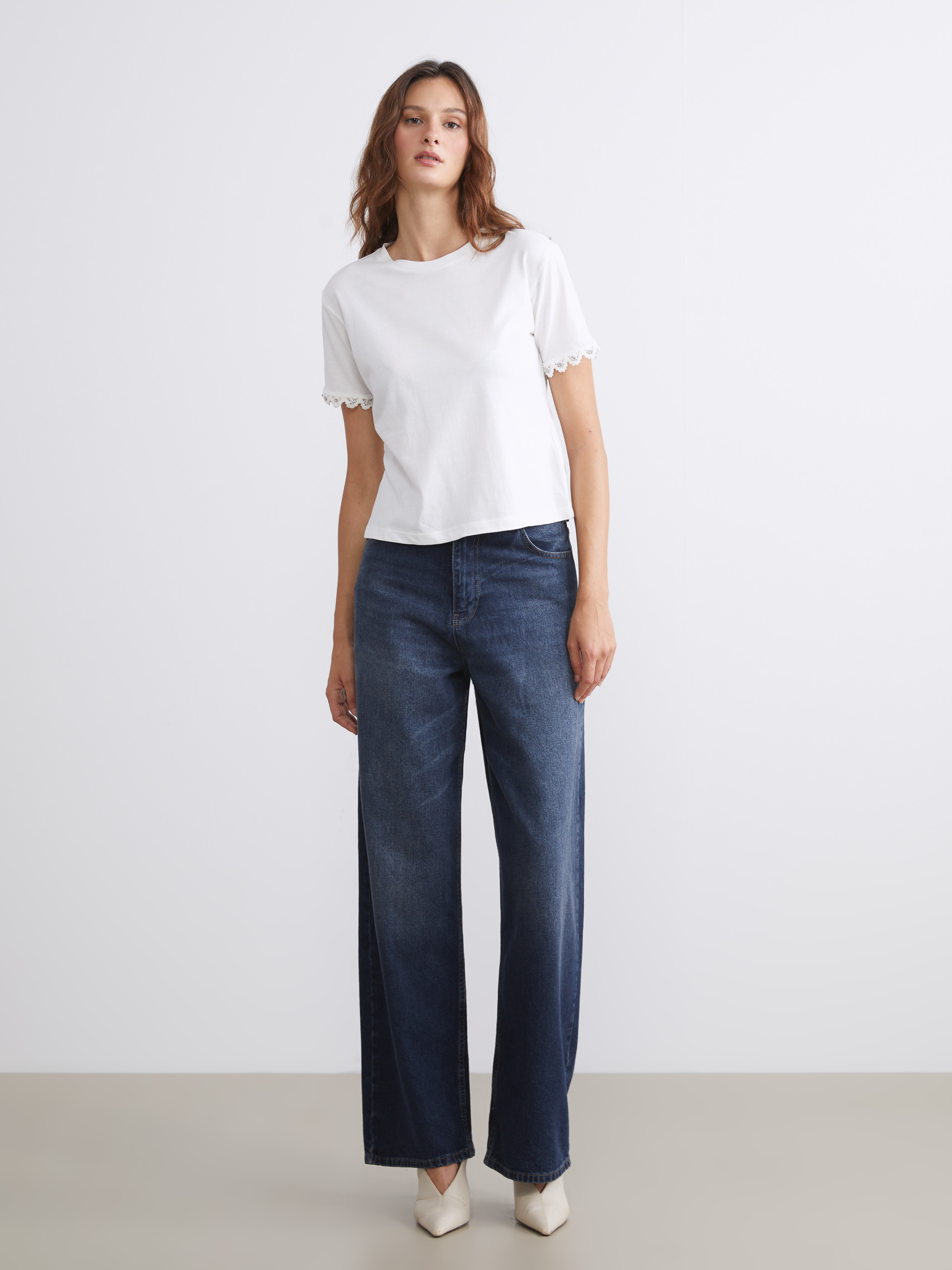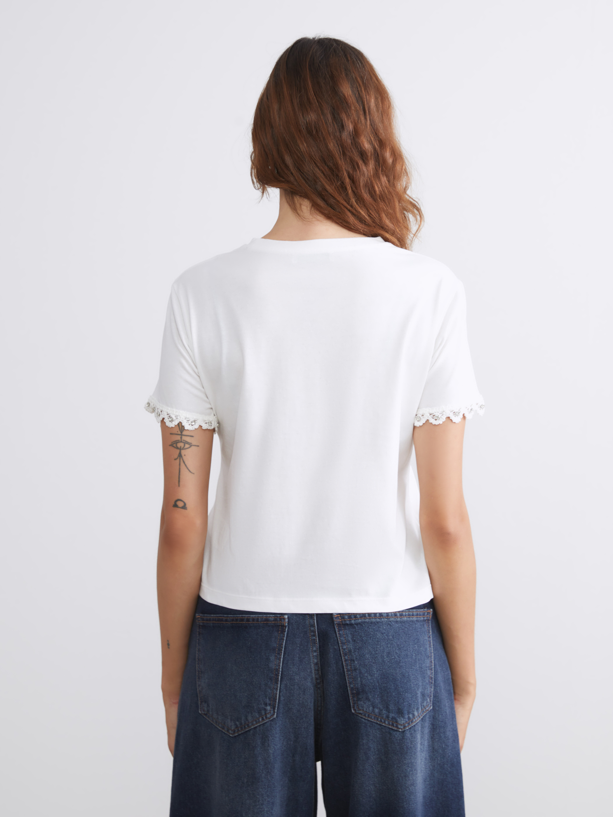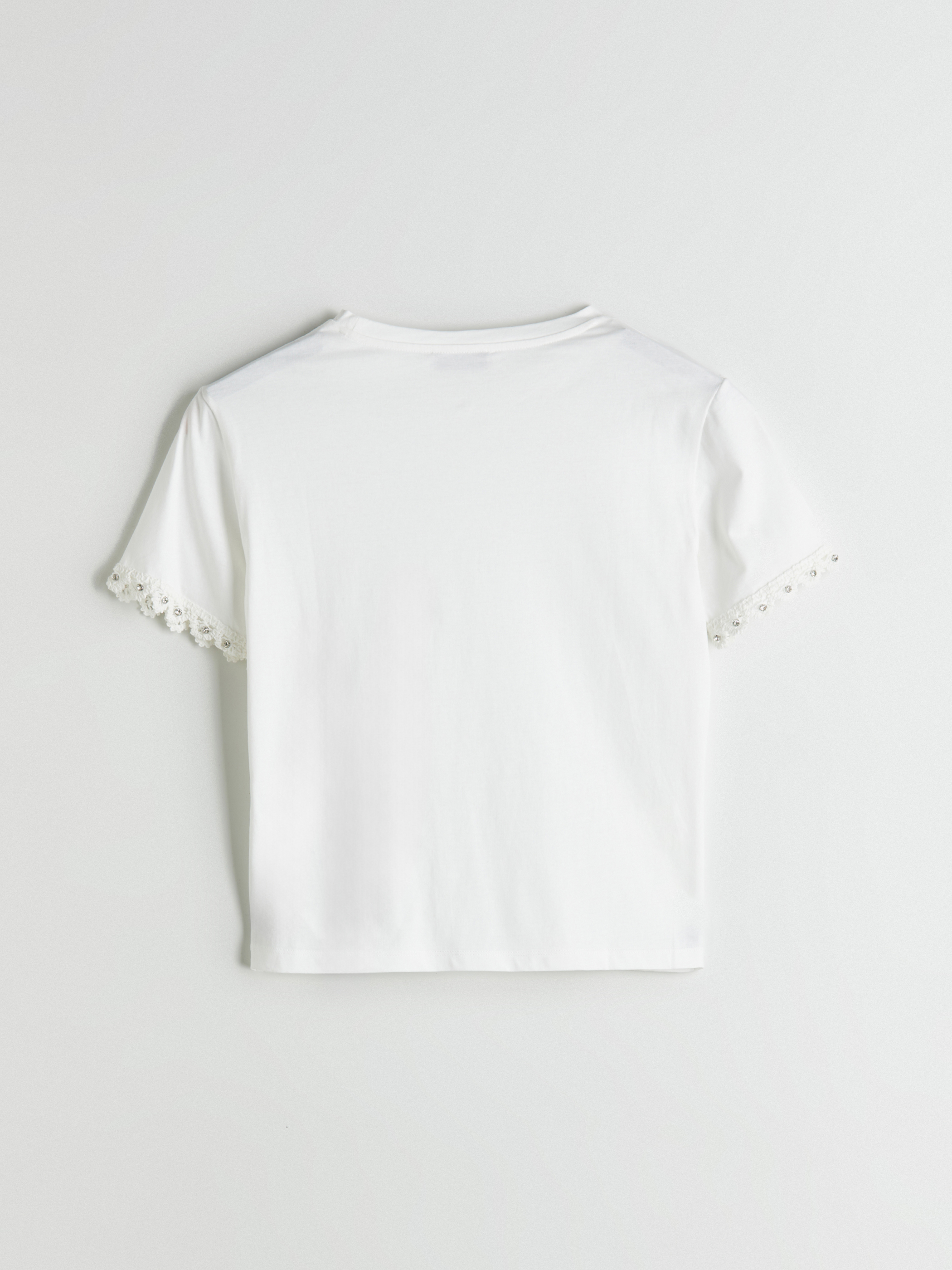 Bisiklet yaka kadın bluz, süprem kumaştan üretilmiştir. Kol uçları dantelli ve taş detaylıdır.