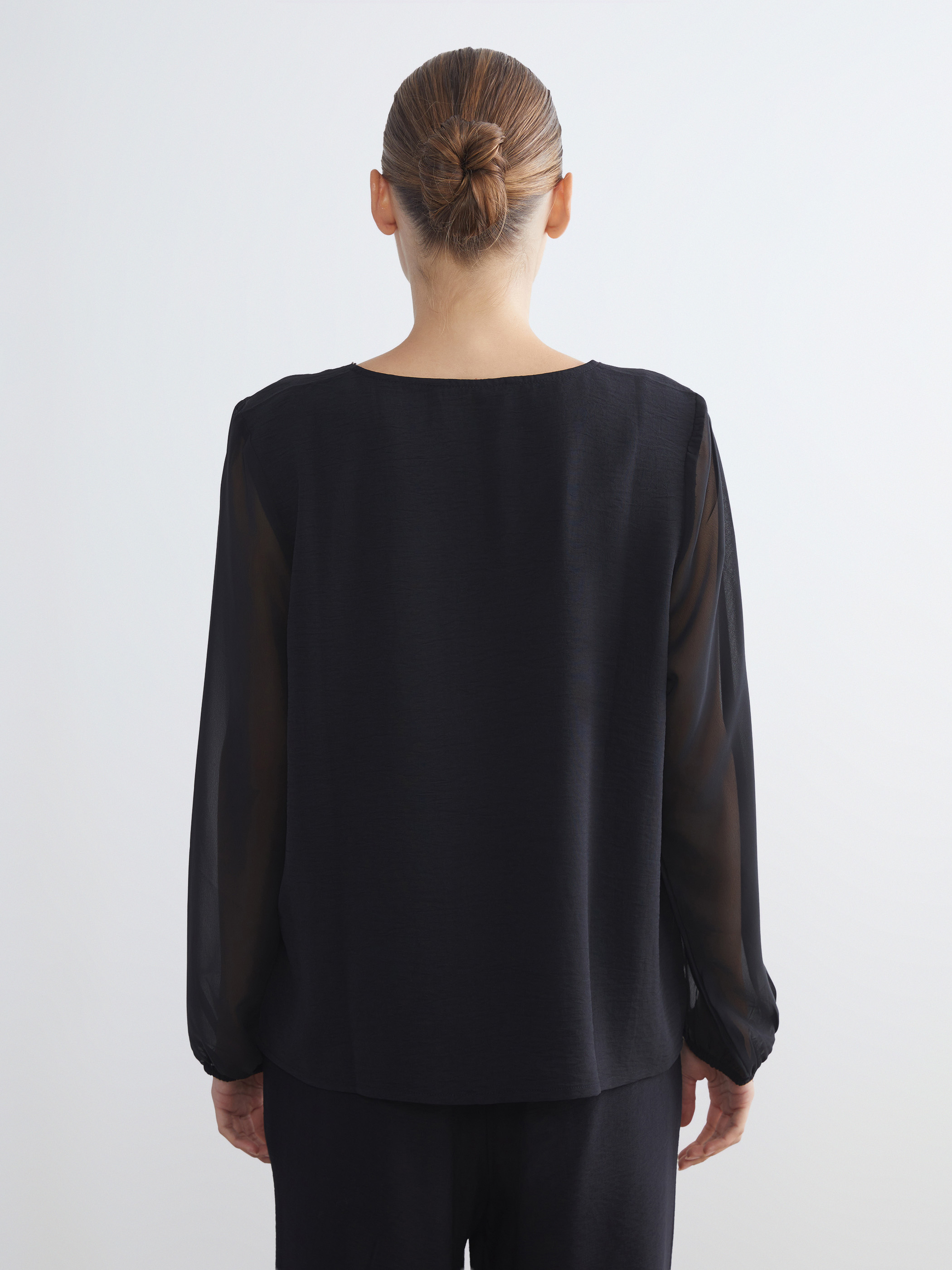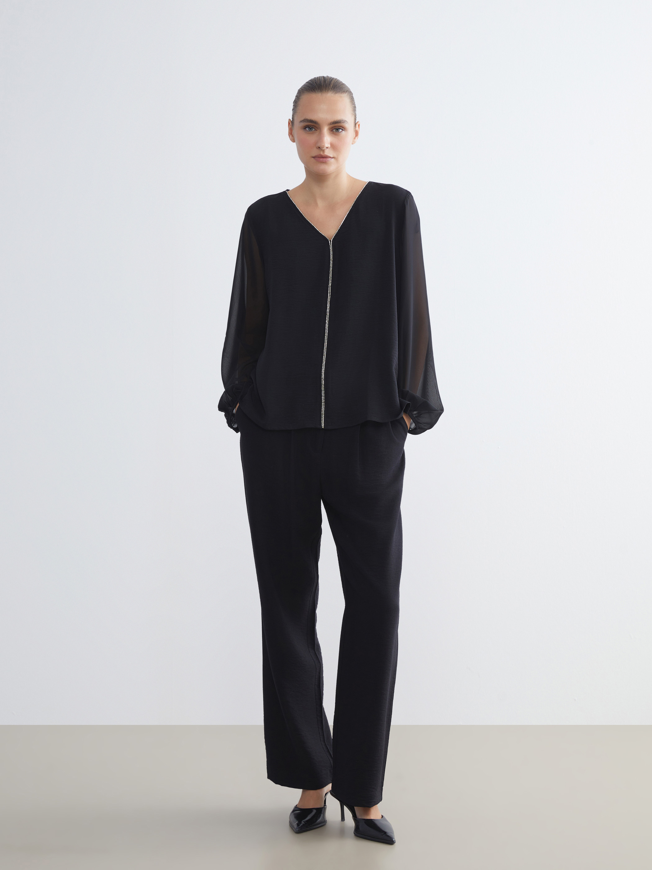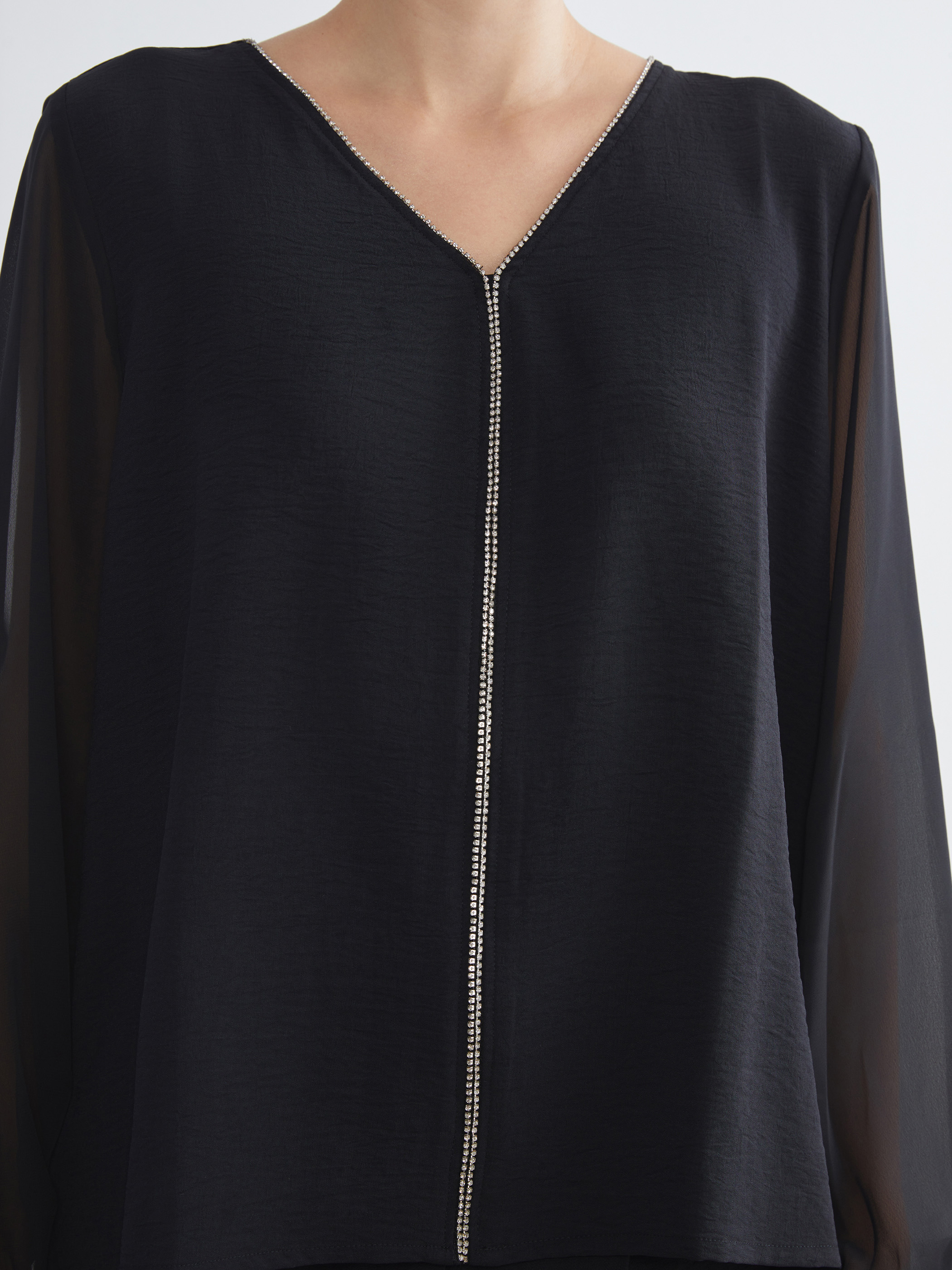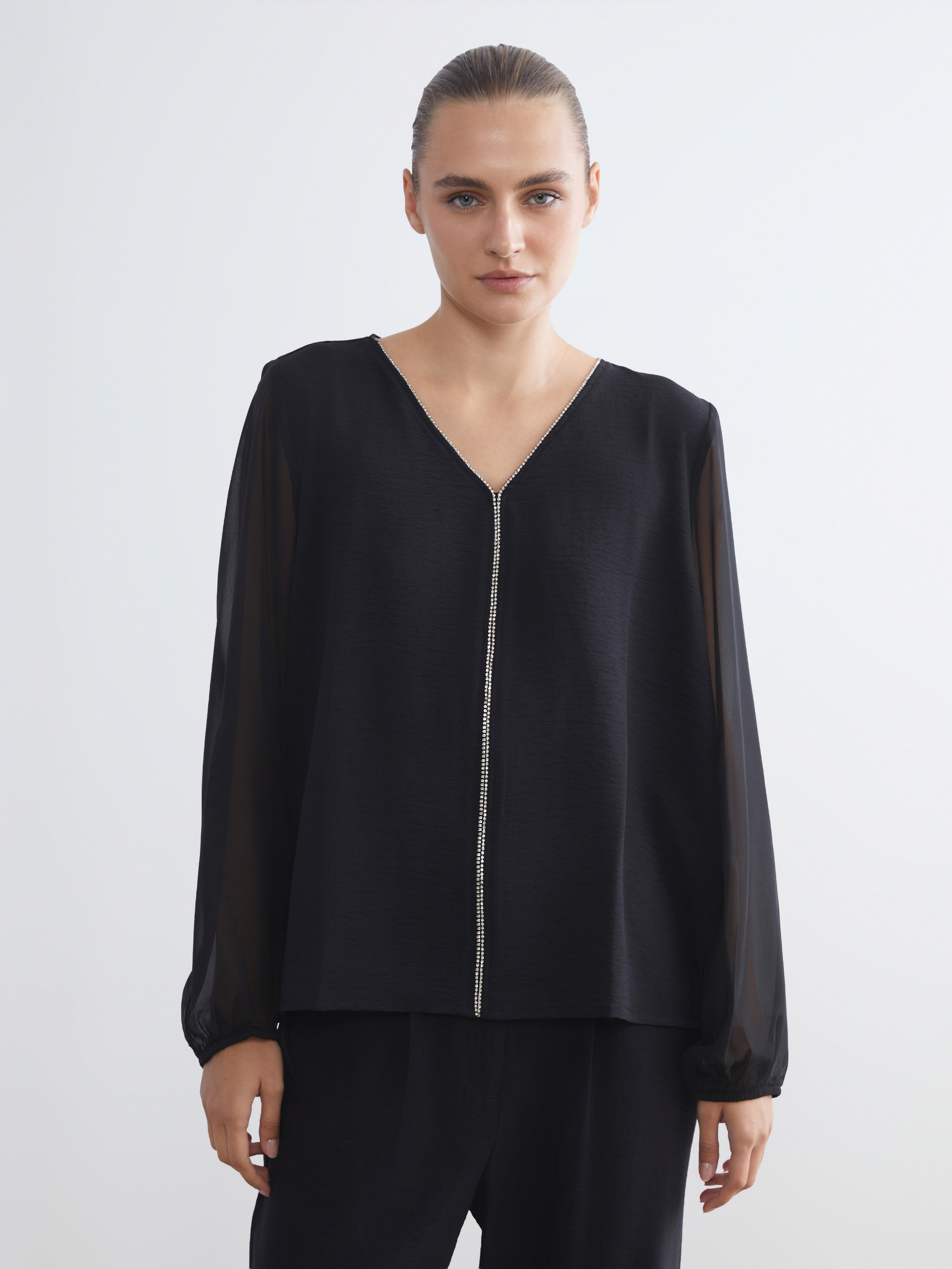 V yakalı kadın bluz, uzun ve lastikli kol uçlarına sahiptir. Yaka ve ön ortasında taş işlemeli şerit detayı bulunur, kol uçları lastiklidir.