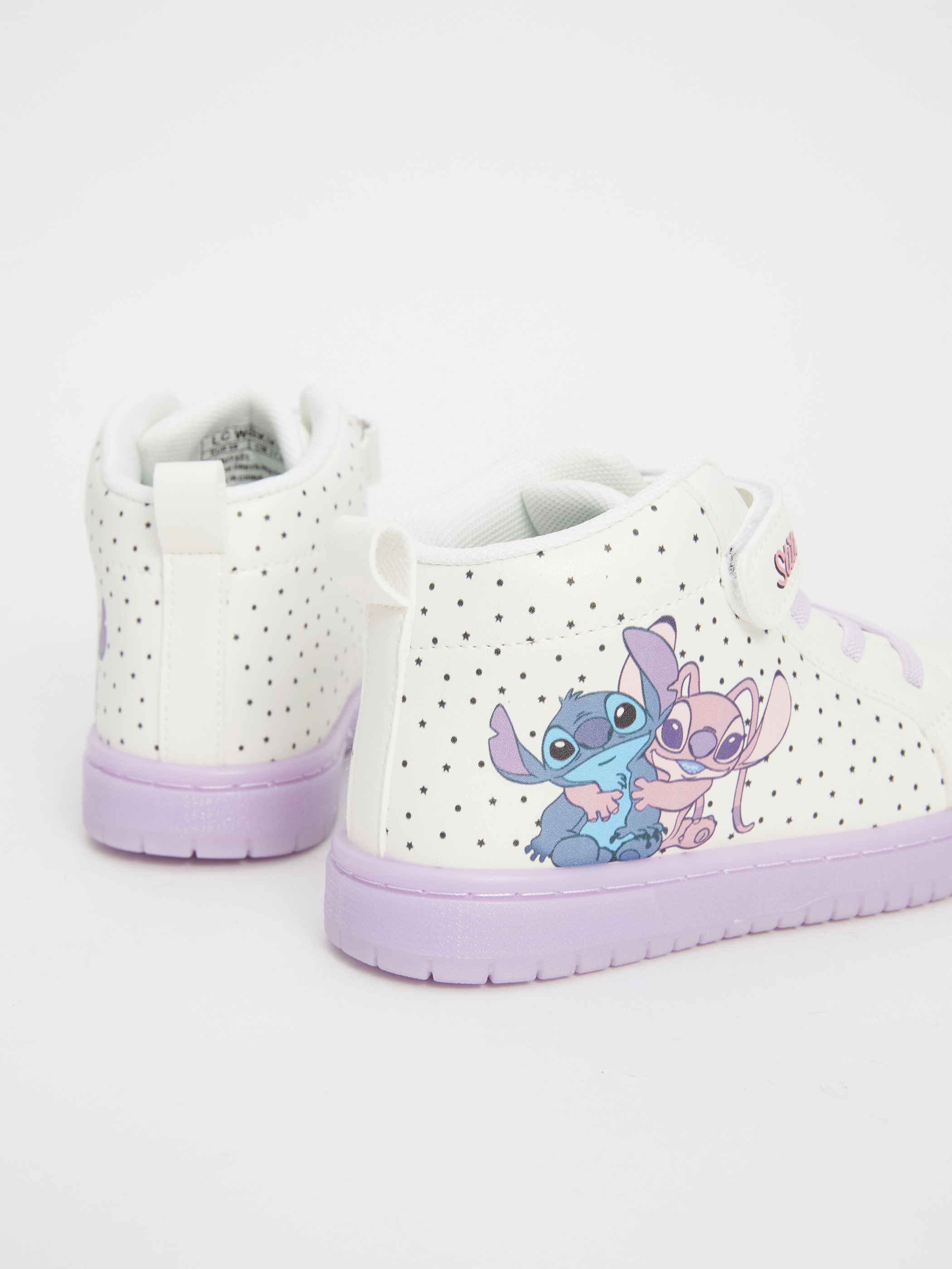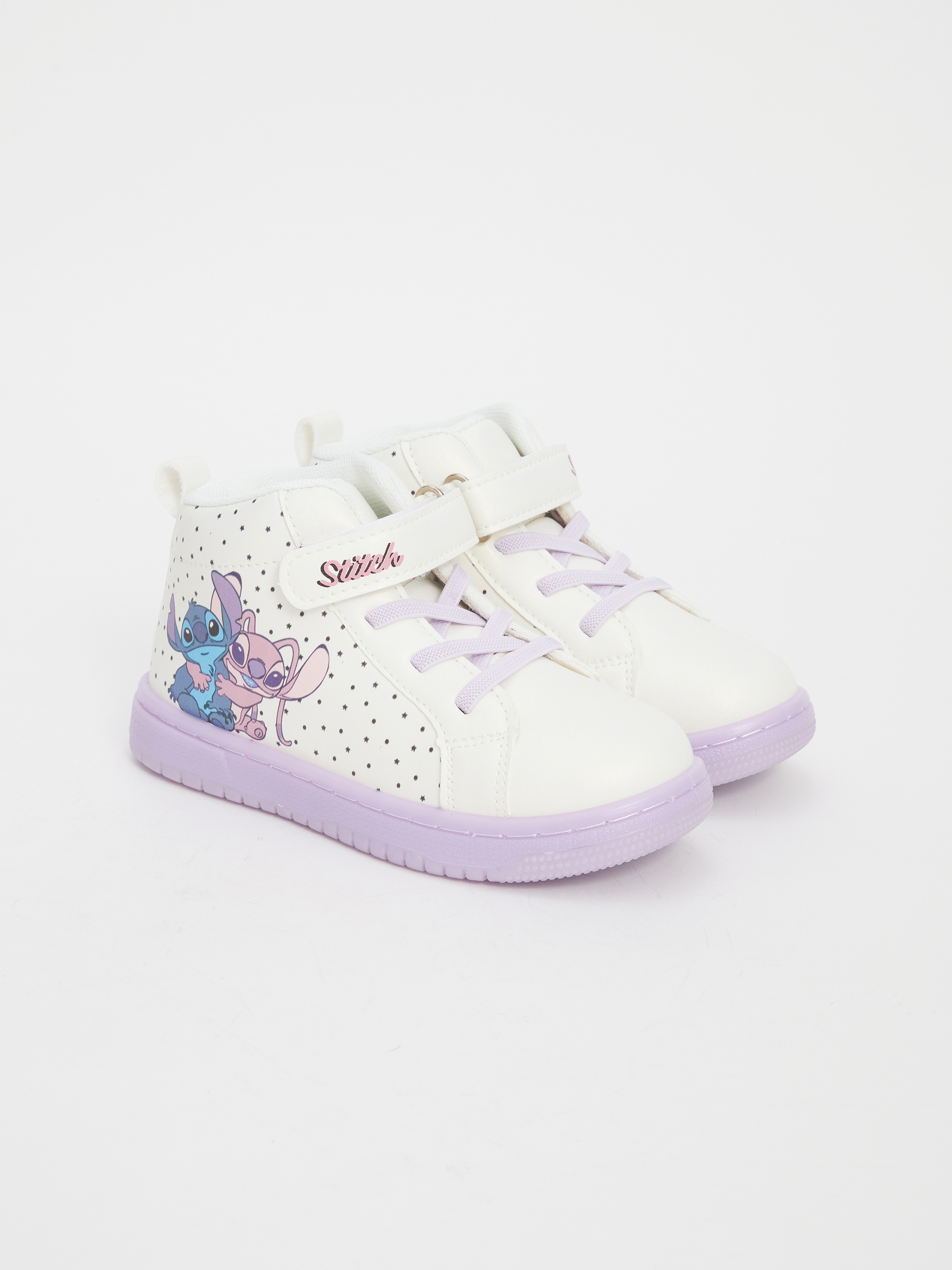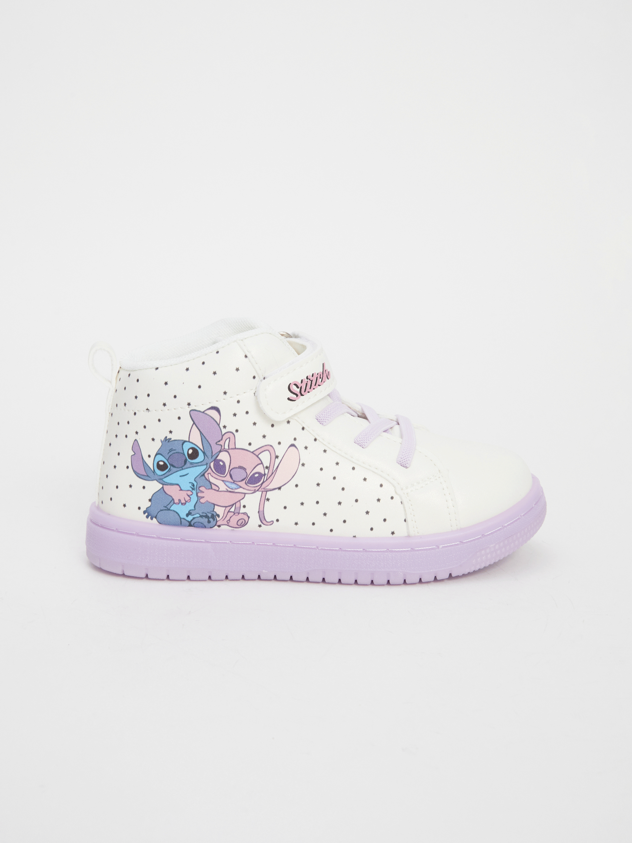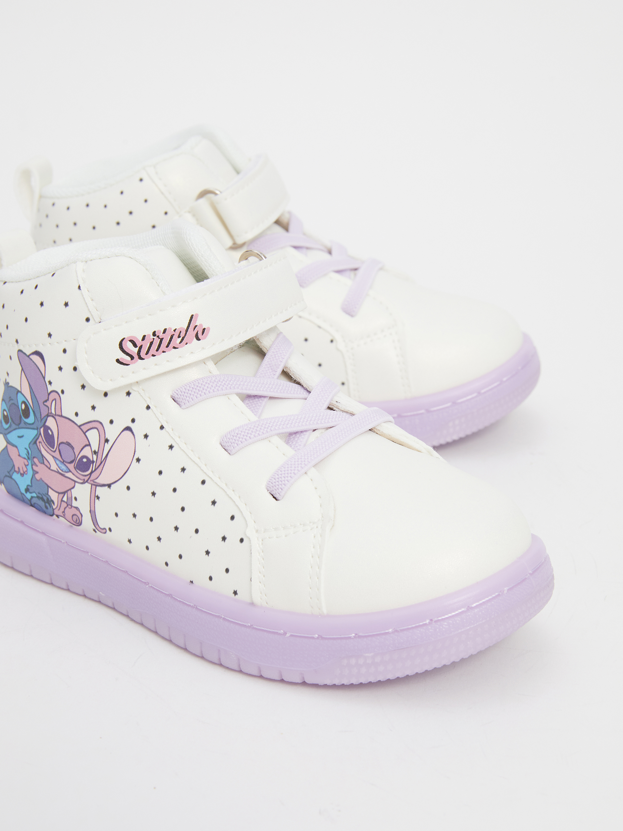 Lilo & Stitch baskılı, ışıklı tabanlı kız bebek bot, bağcıklı ve cırt cırtlı tasarımıyla eğlenceli ve kolay giyim sunar.