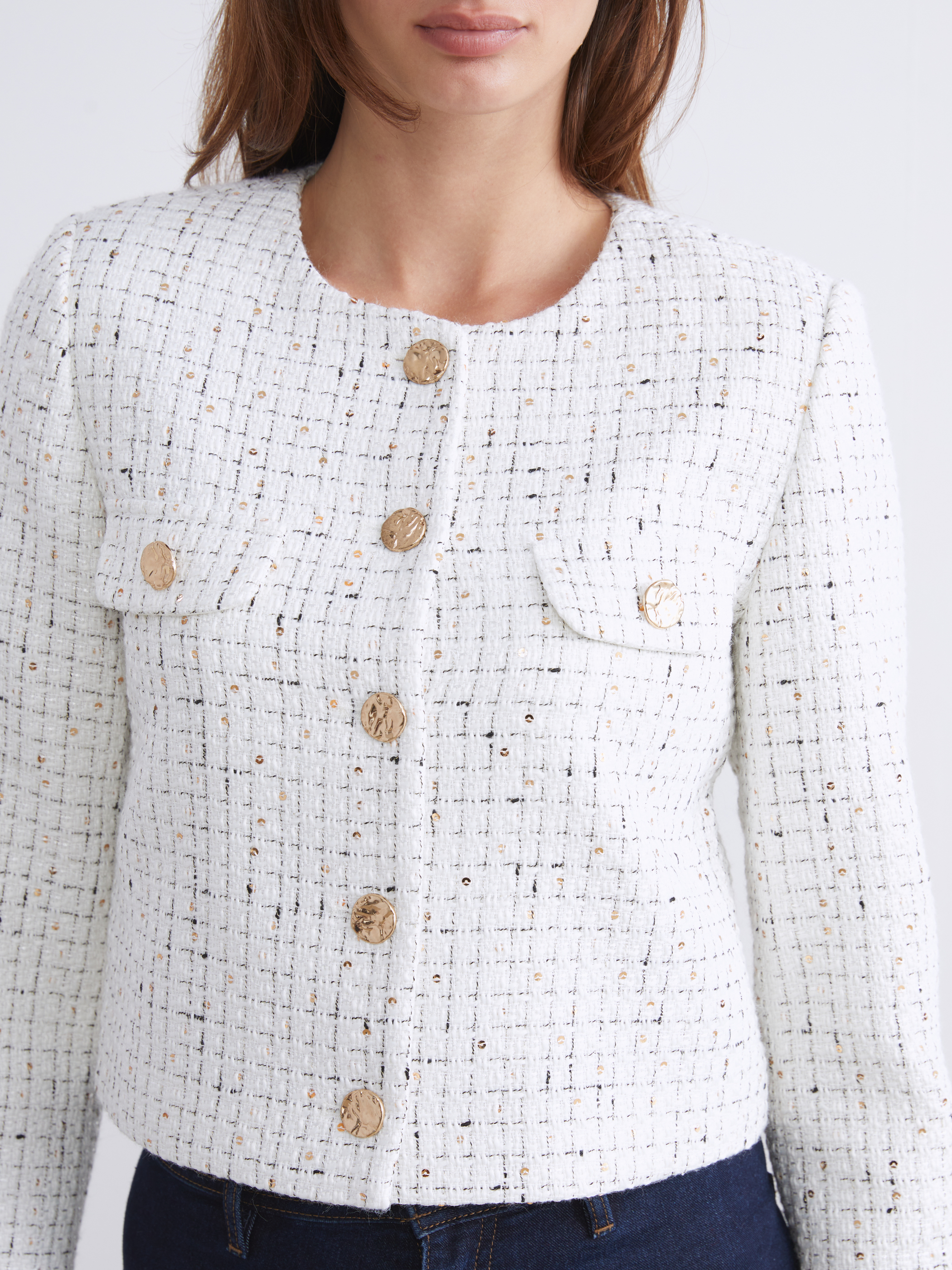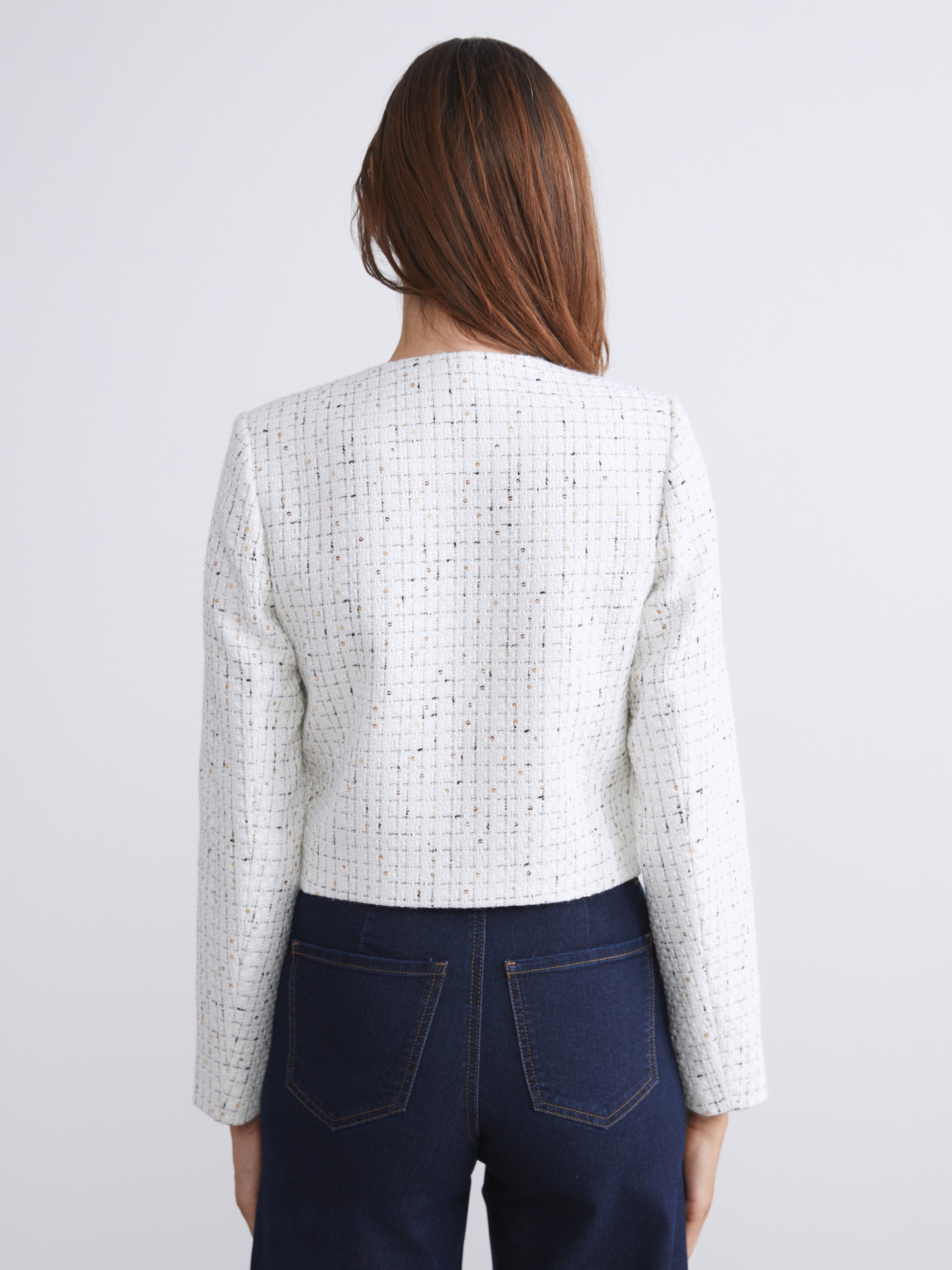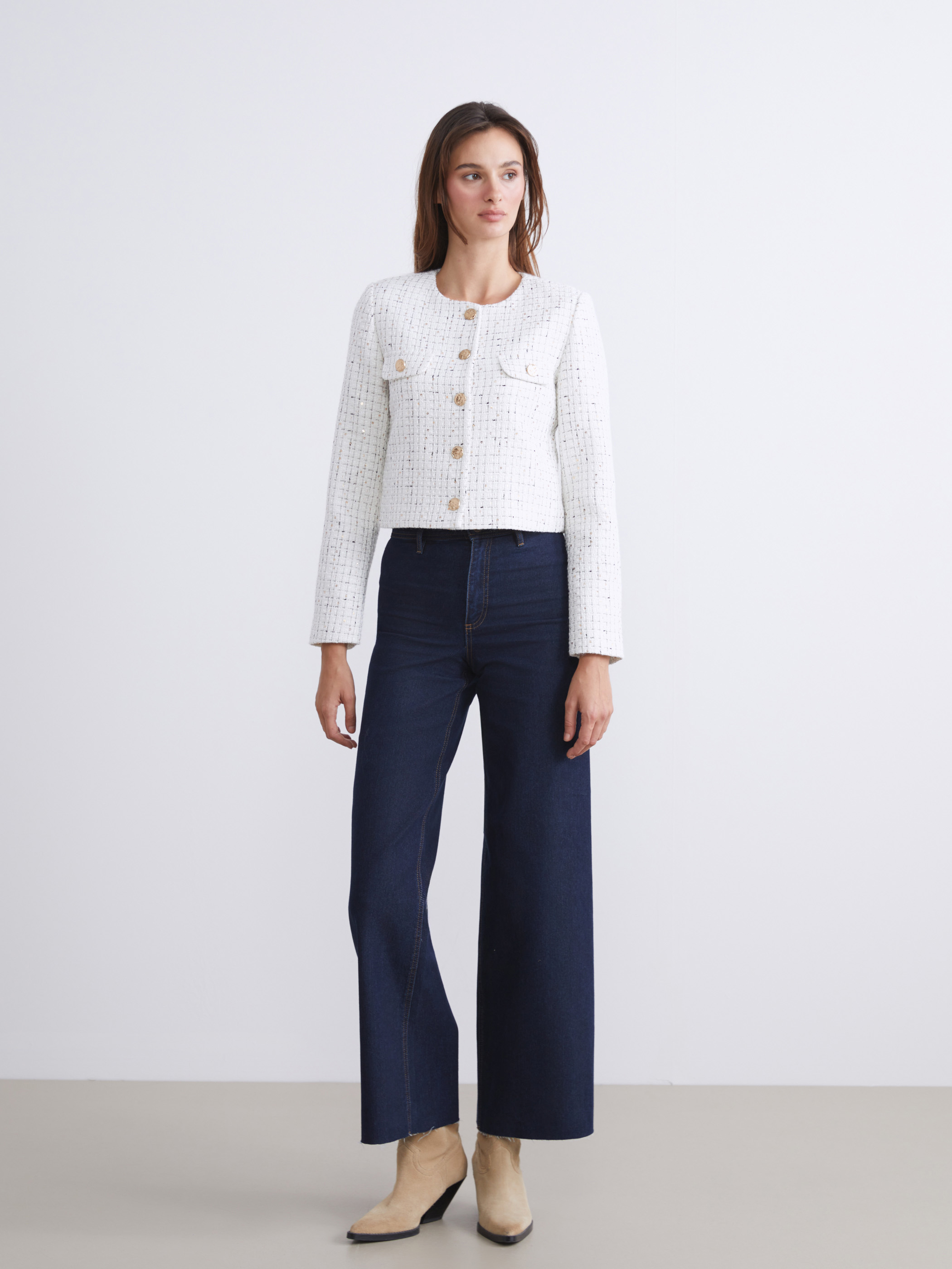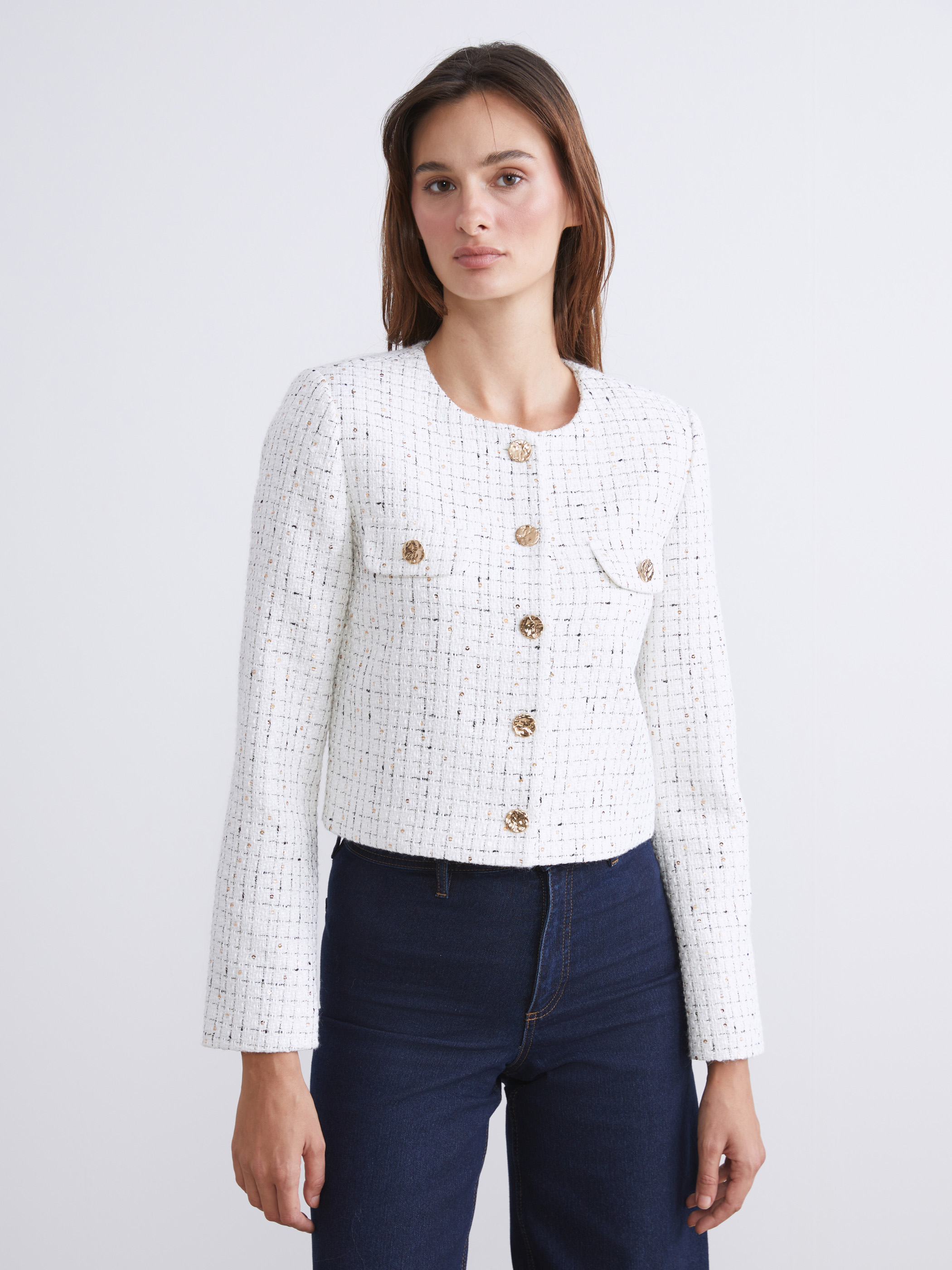 Bisiklet yaka, uzun kollu kadın tüvit ceket, taş işlemelidir. Önden düğme kapamalıdır ve kapaklı göğüs cepleri bulunur.