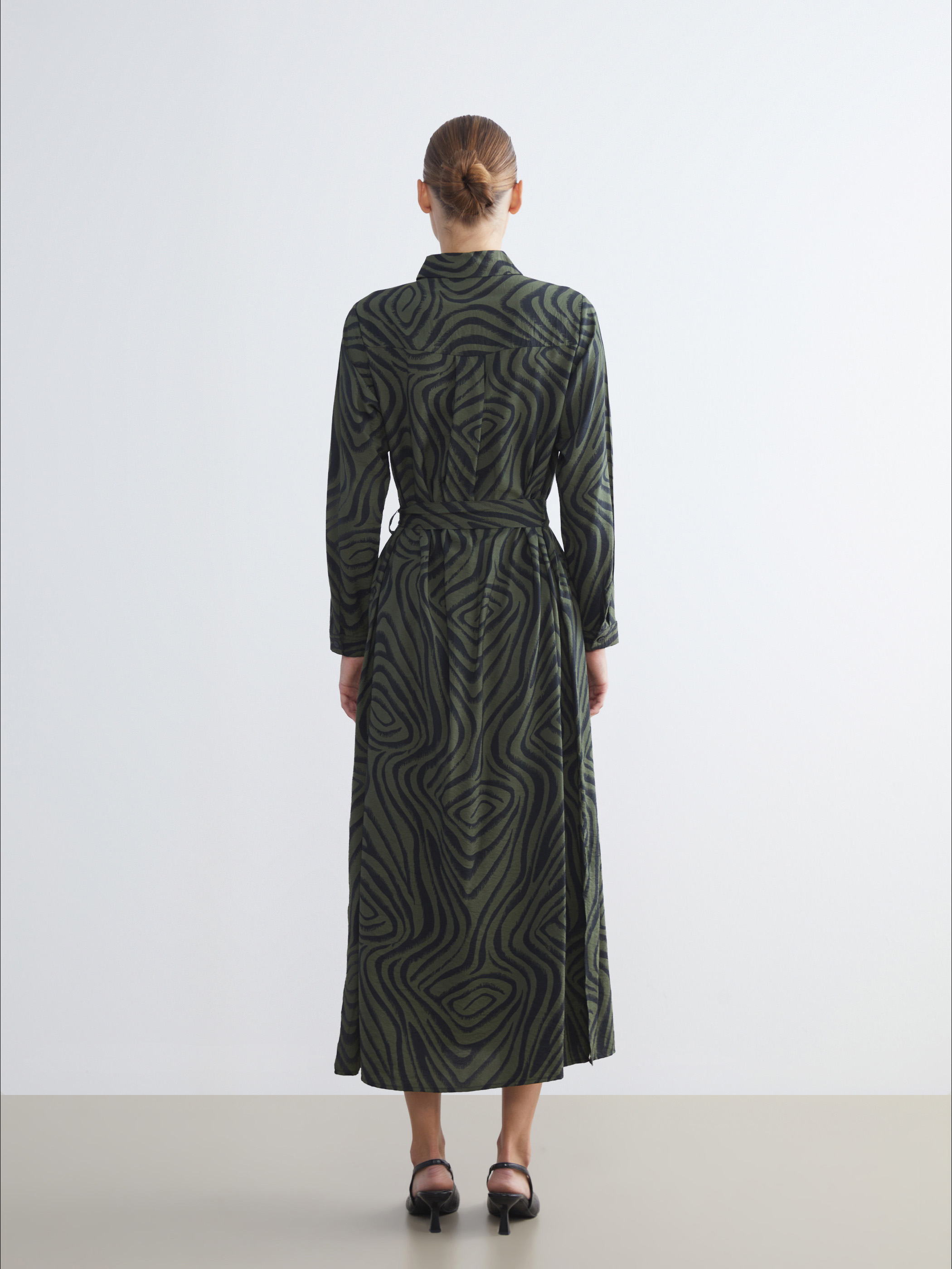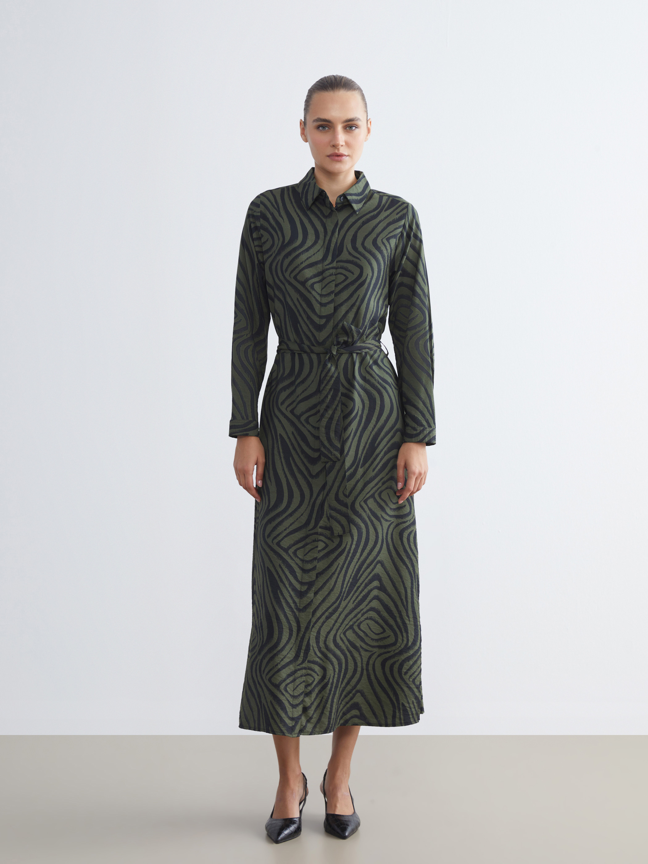 Desenli Kuşaklı Gömlek Elbise YEŞİL BASKILI