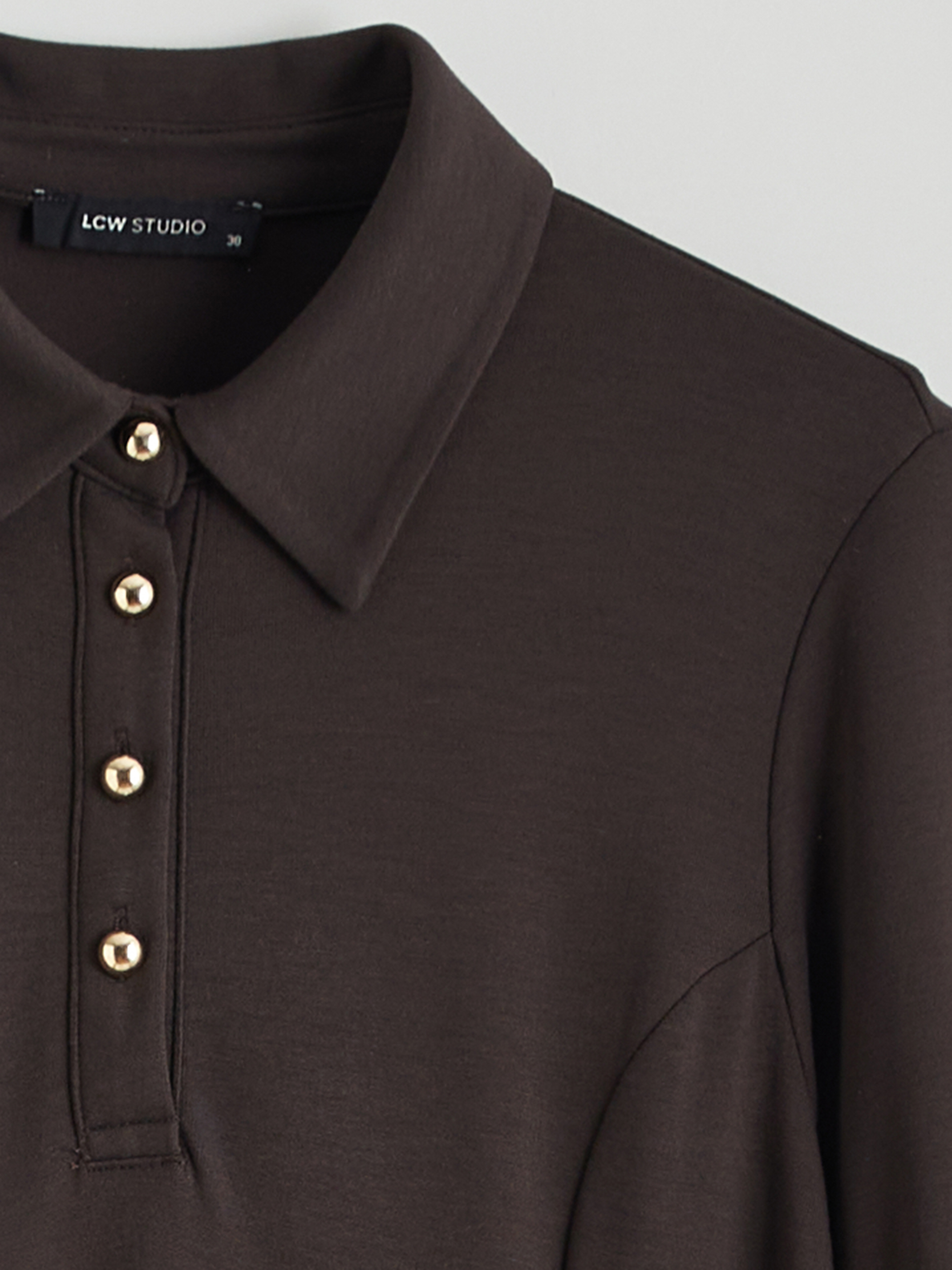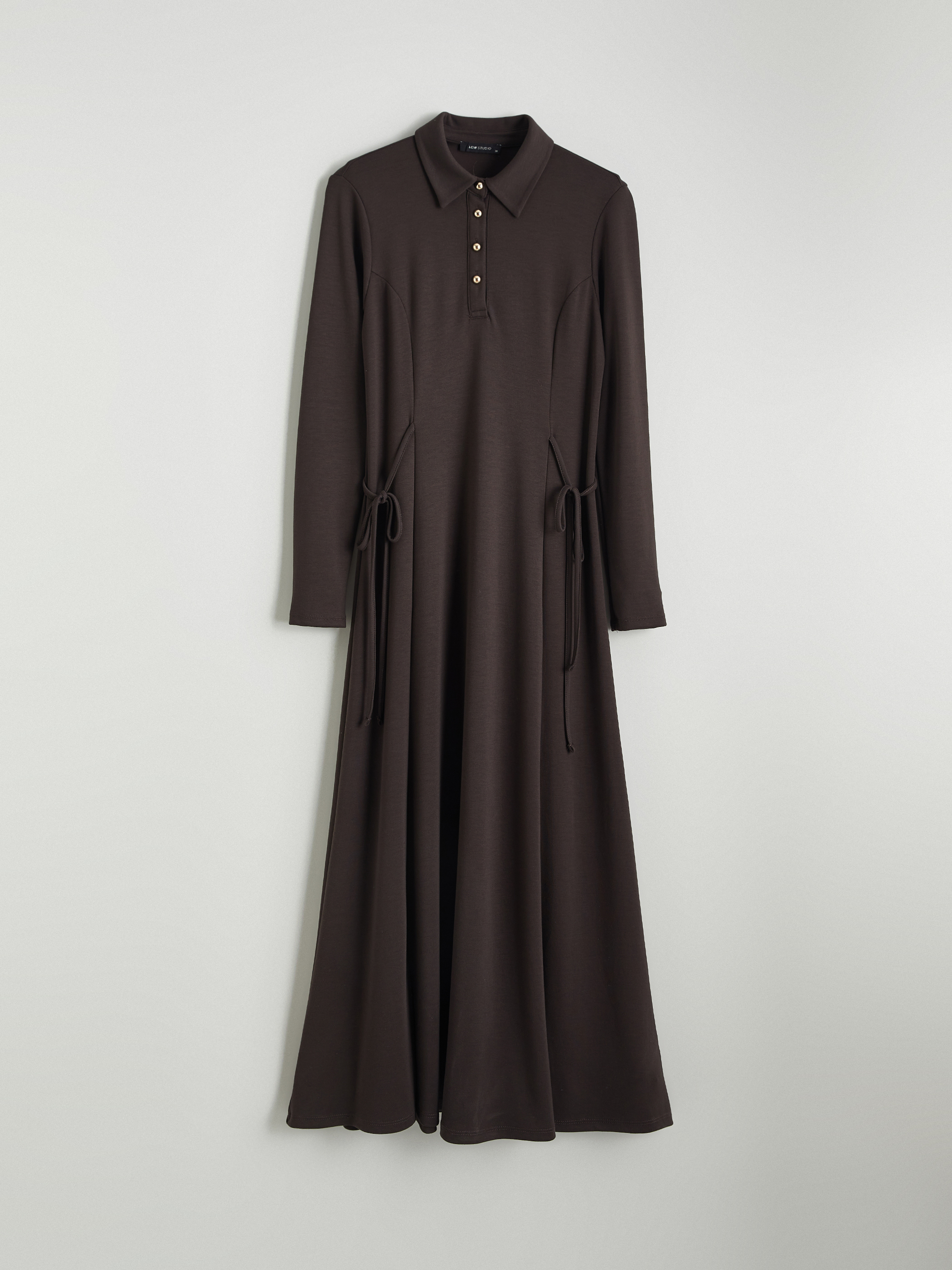 Gömlek yaka, uzun kollu kadın elbise dalgıç kumaştan üretilmiştir. Düğme kapamalıdır ve yanlarında büzgü detayları bulunur.