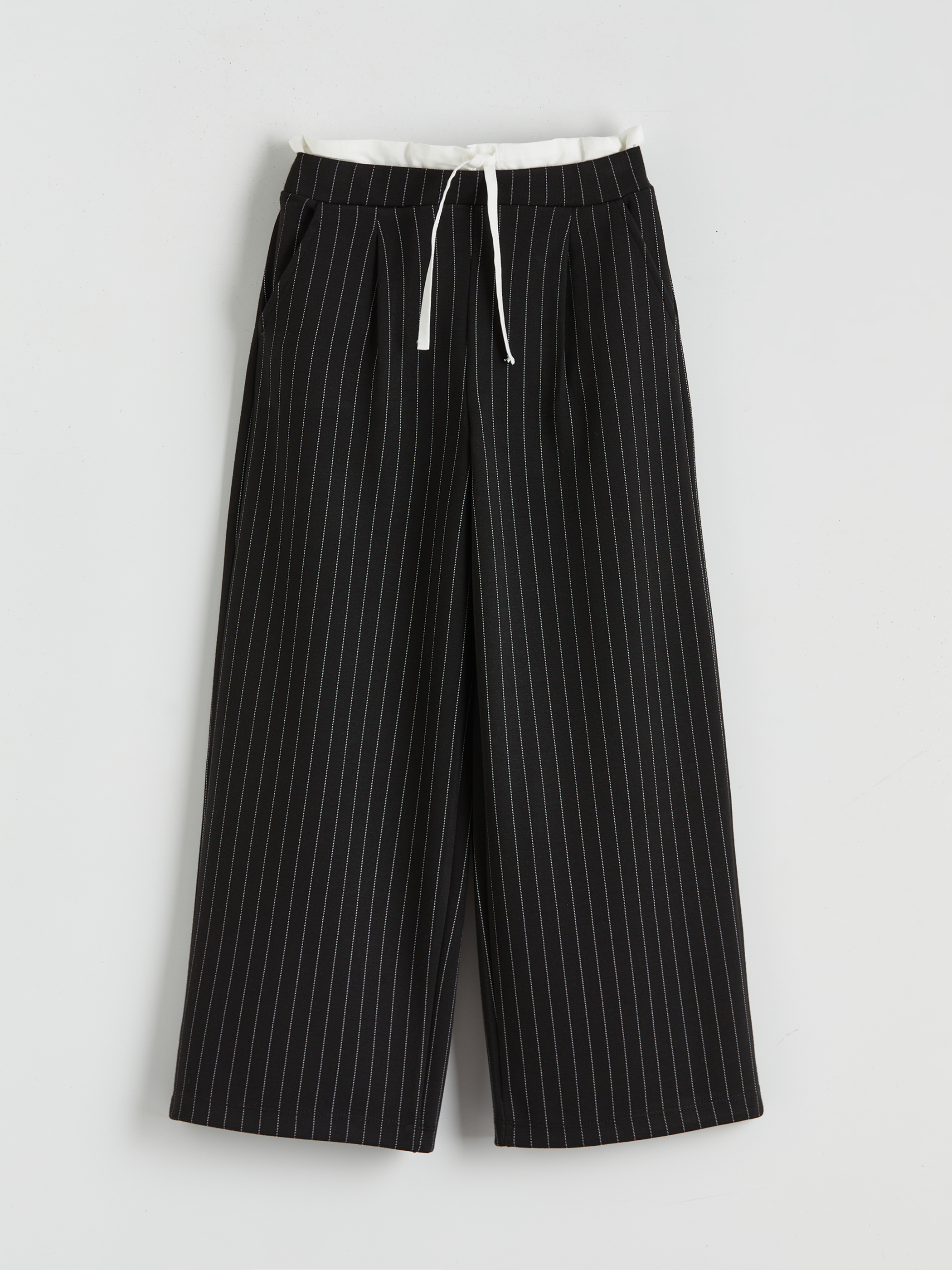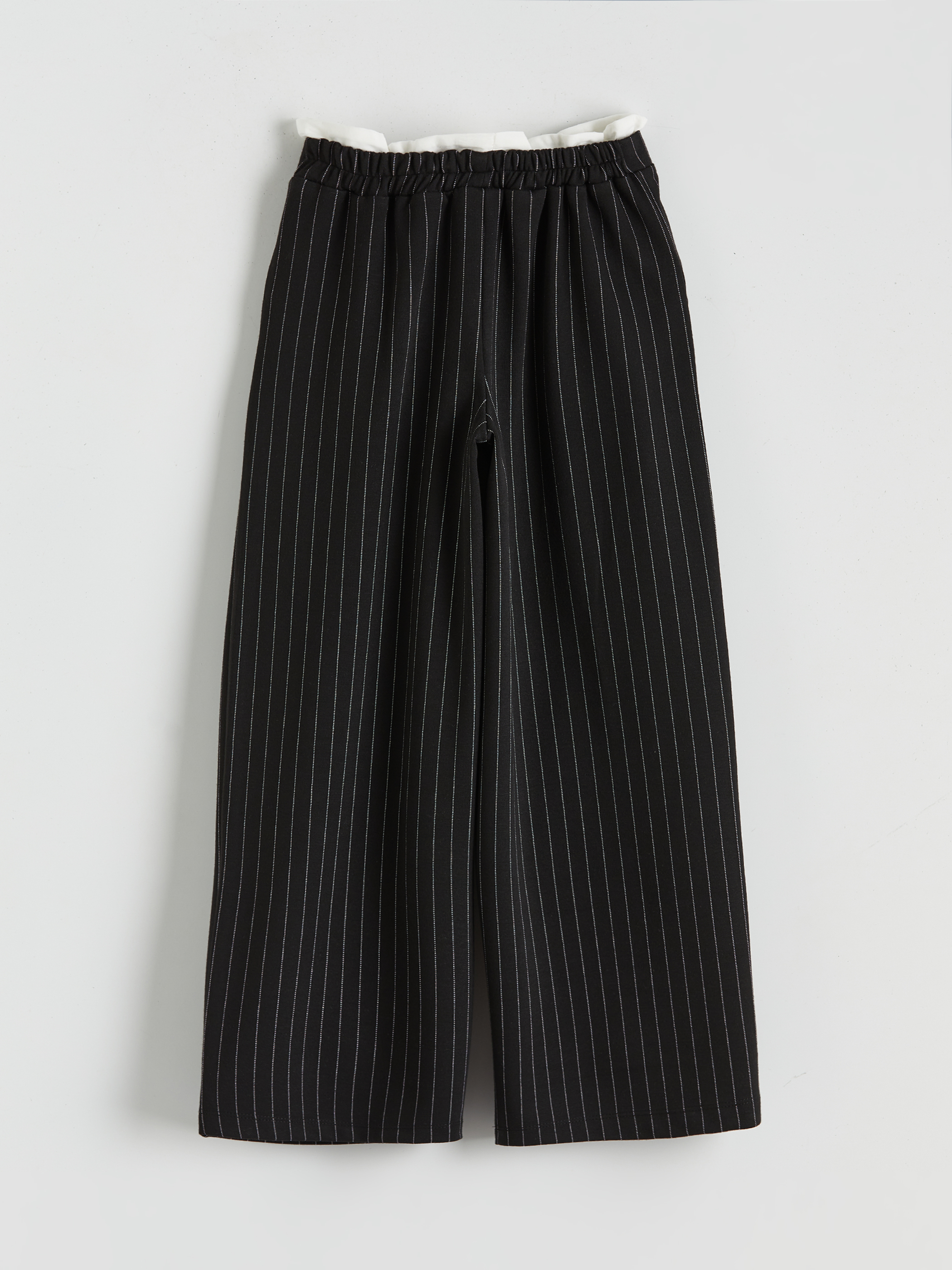 Beli lastikli ve fırfırlı, çizgili desenli kız çocuk pantolon, %100 pamuklu 3 iplik şardonlu kumaştan üretilmiştir. Geniş paçalı ve yan ceplidir.