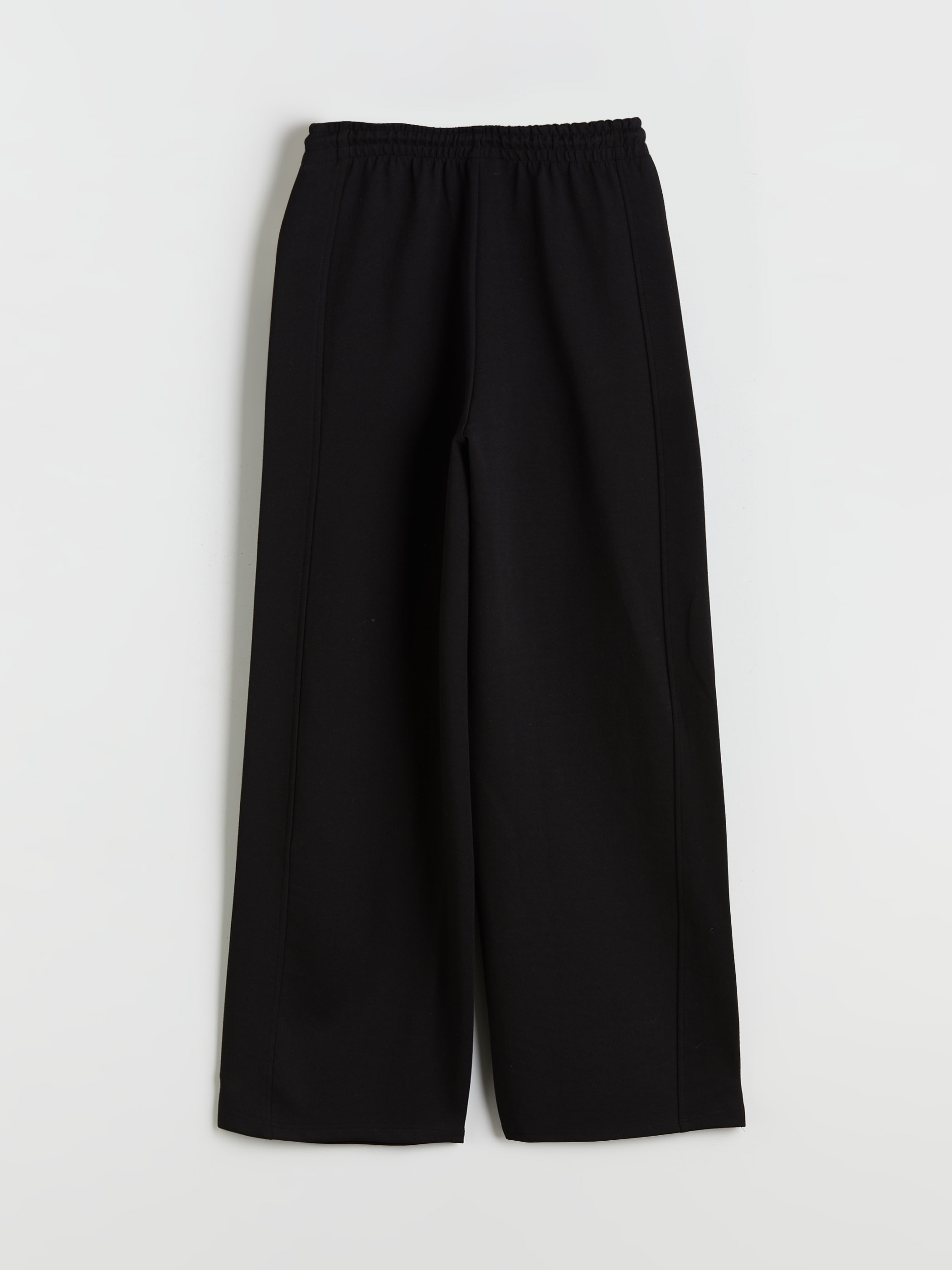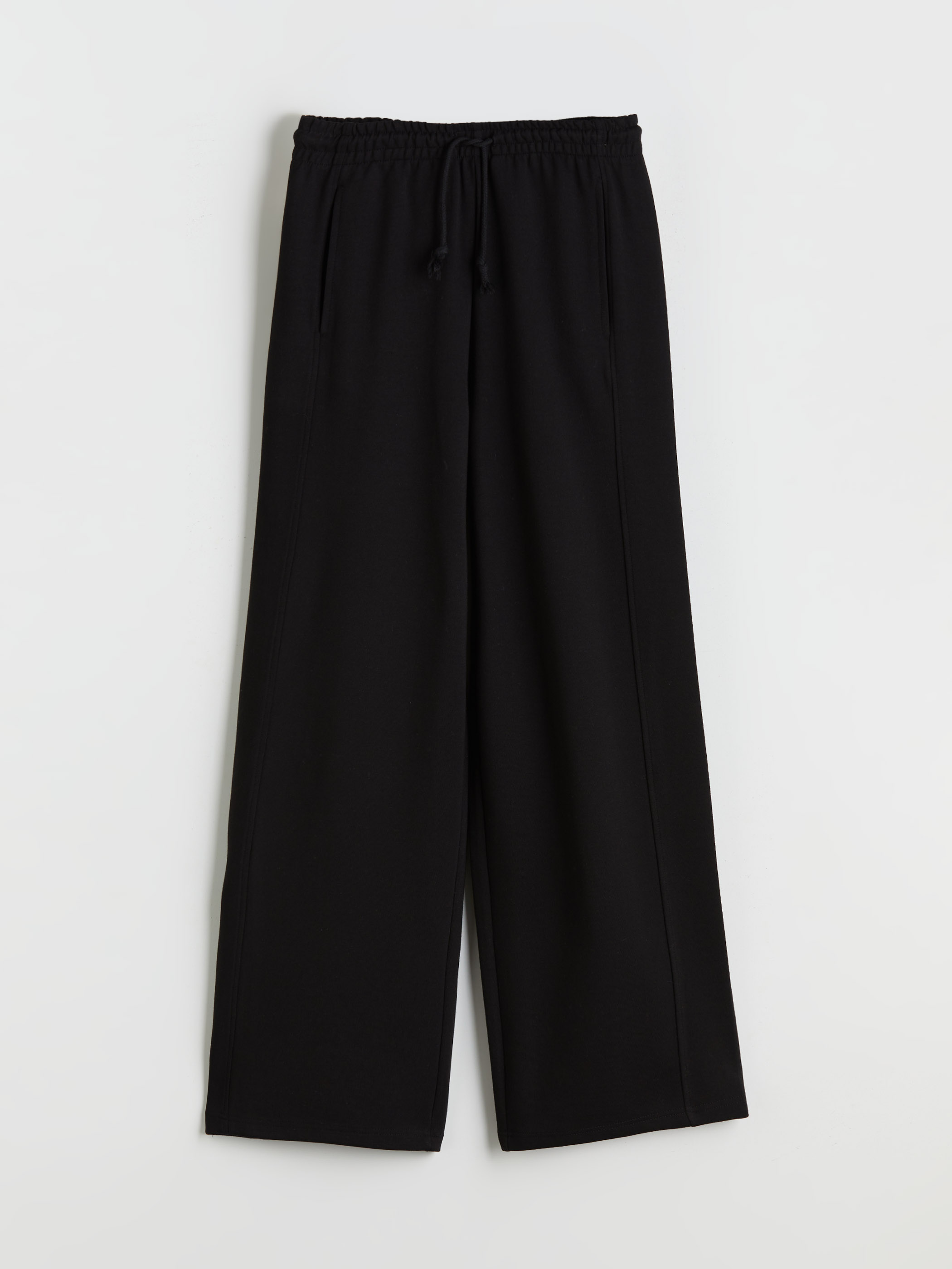 Geniş paçalı kadın eşofman altı, beli lastikli ve ayarlanabilir bağcıklıdır. İnterlok kumaştan üretilmiştir ve önü dikiş detaylıdır.