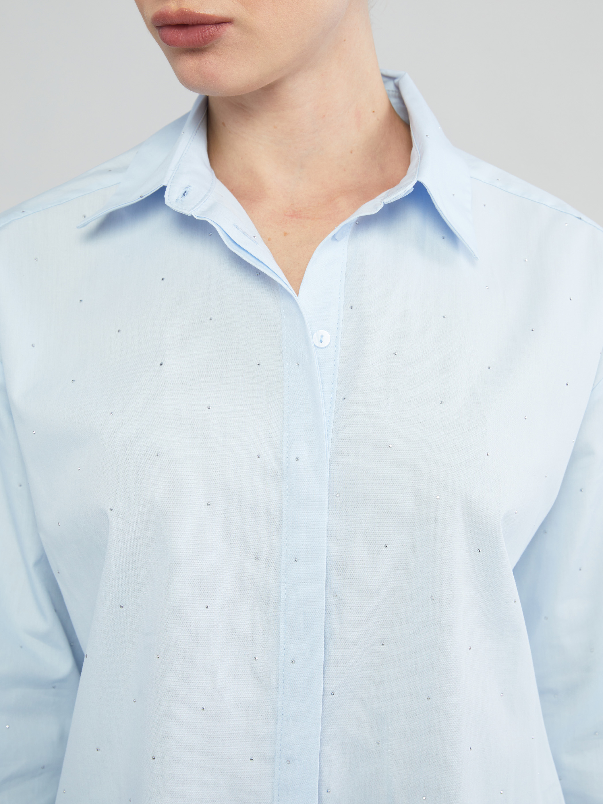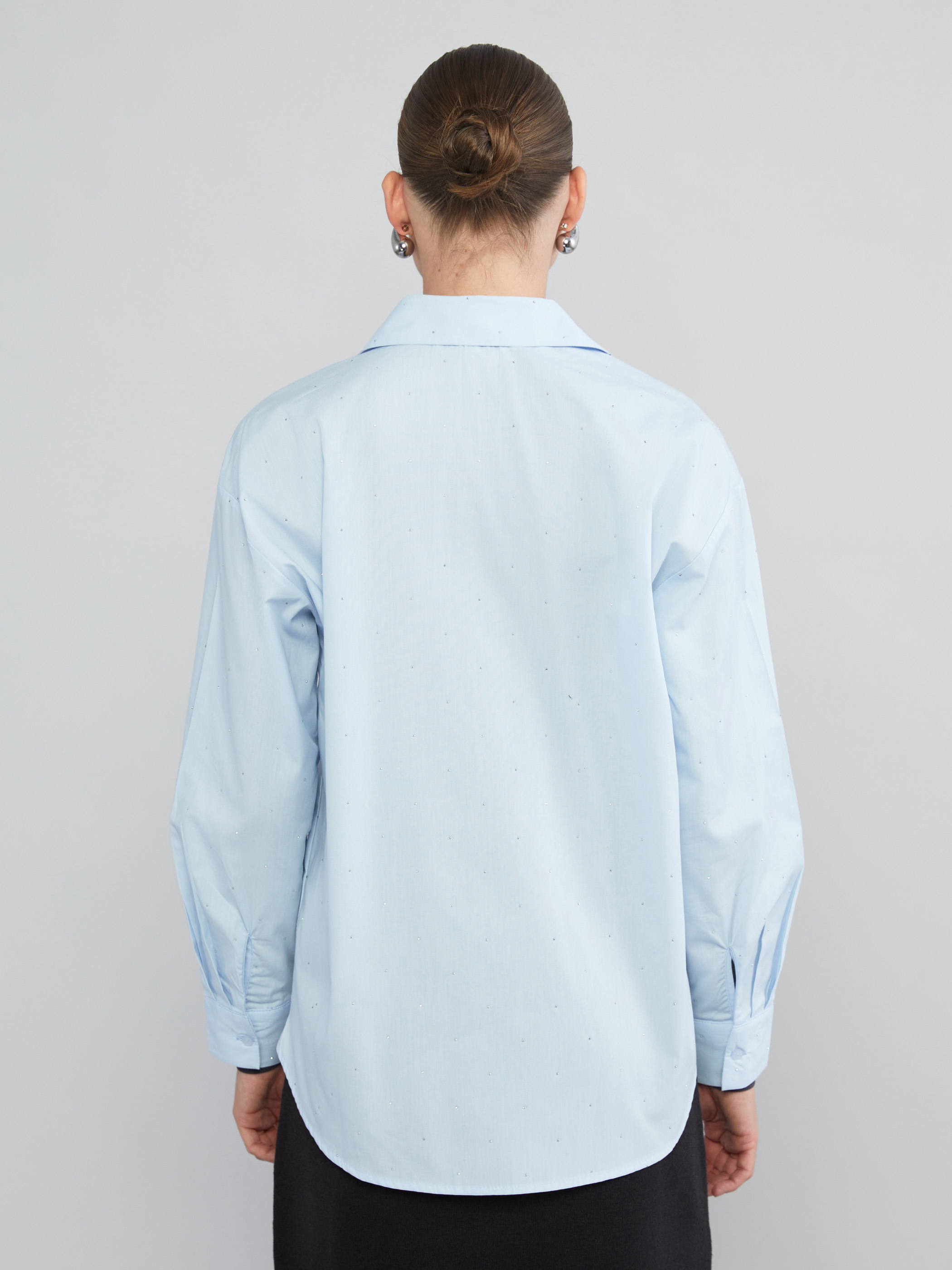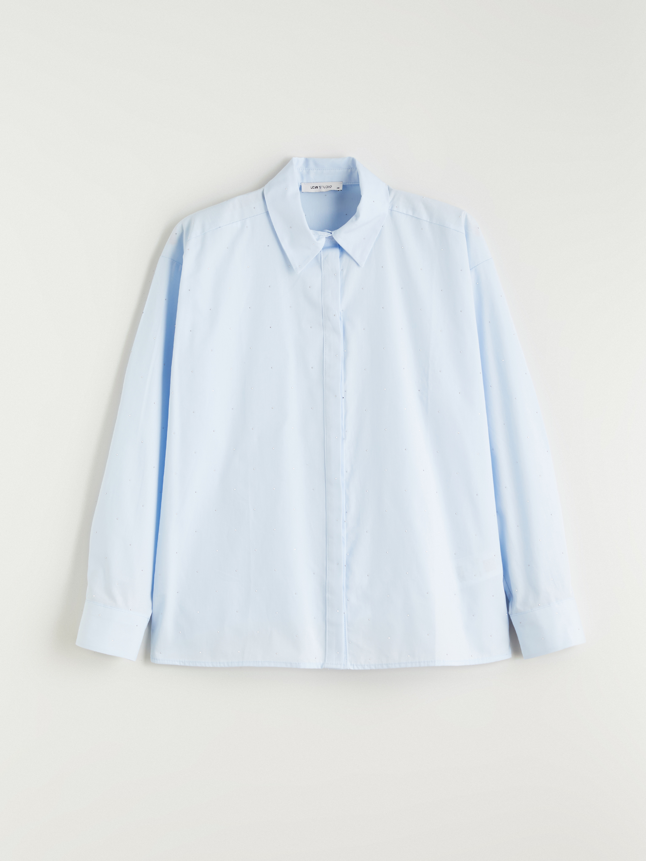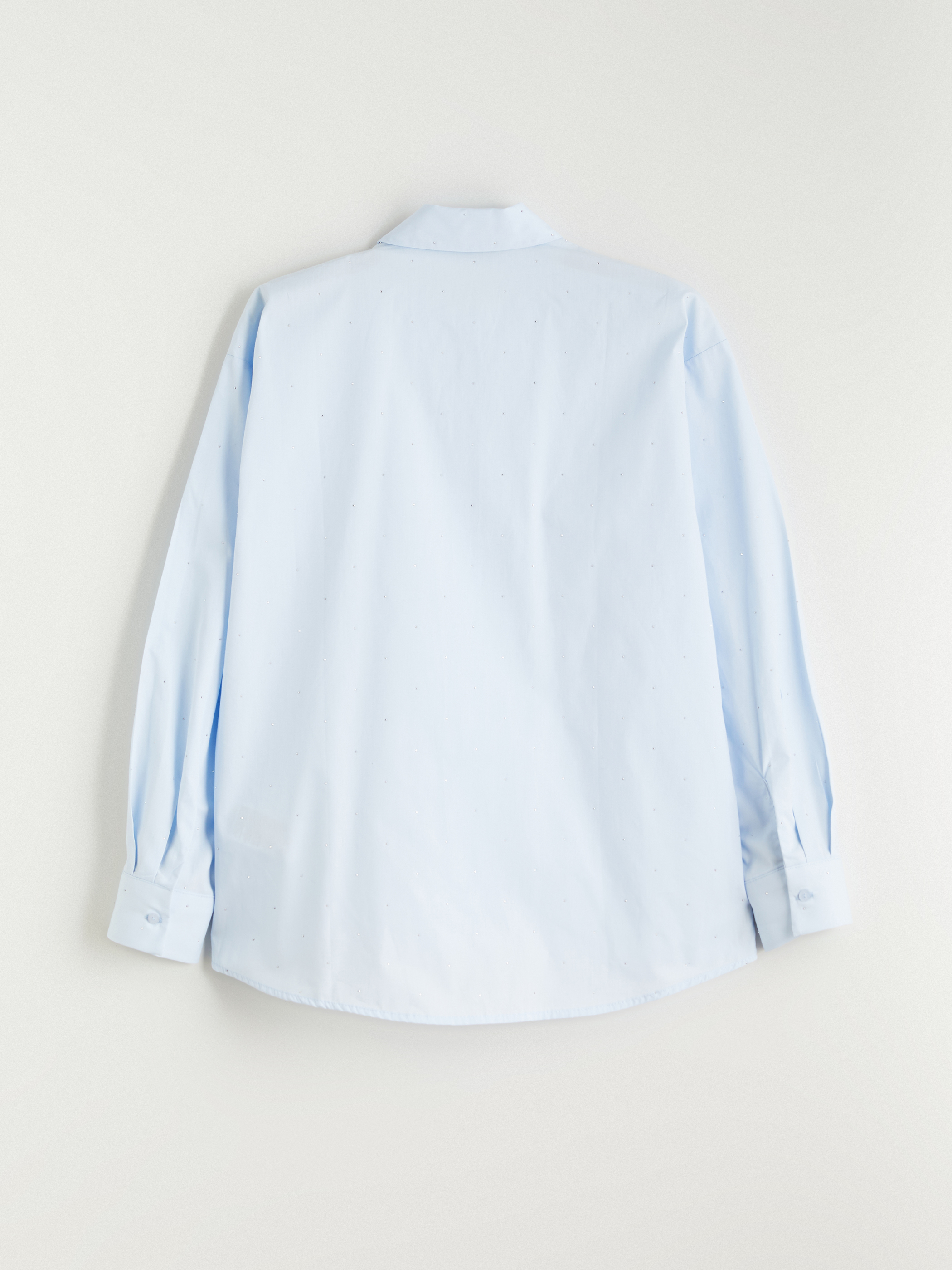 Taşlı, gömlek yaka kadın gömlek, %100 pamuklu kumaştan üretilmiştir. Uzun kollu ve manşetlidir. Önden gizli patlı ve düğme kapamalıdır.