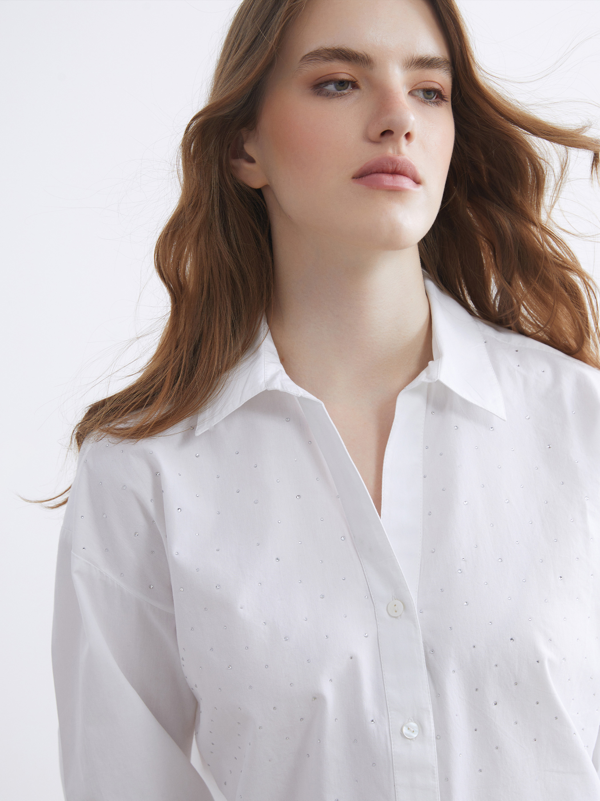 Gömlek yakalı, uzun kollu ve manşetli kadın gömlek, parlak taş işlemelidir ve önden düğme kapamalıdır.