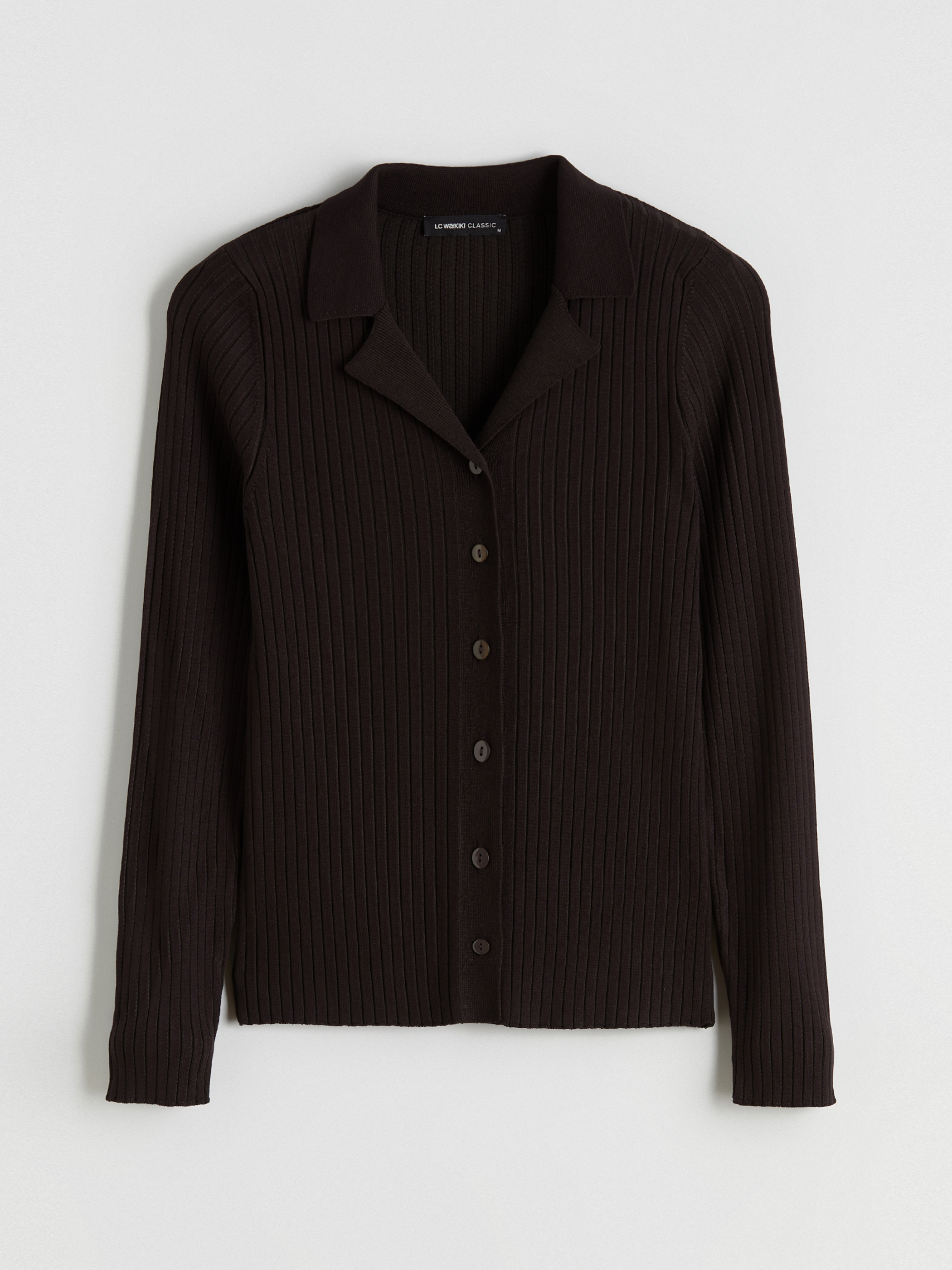 Polo yaka ve uzun kollu kadın triko hırka, fitilli dokuya sahiptir. Önü boydan boya düğme kapamalıdır.