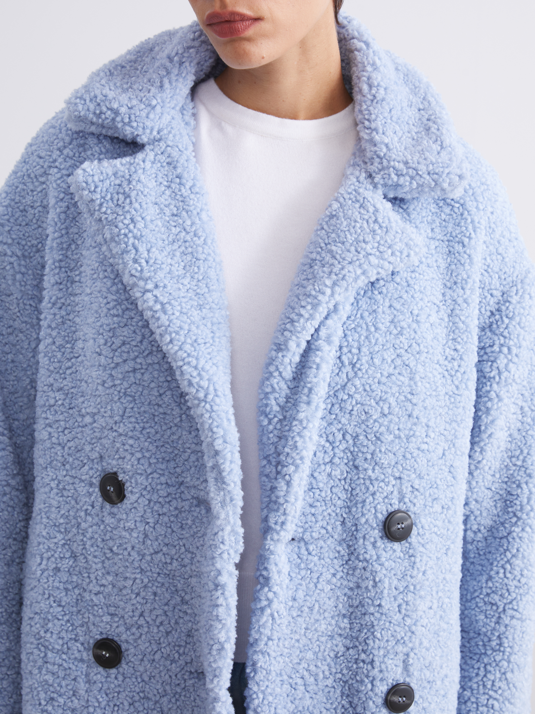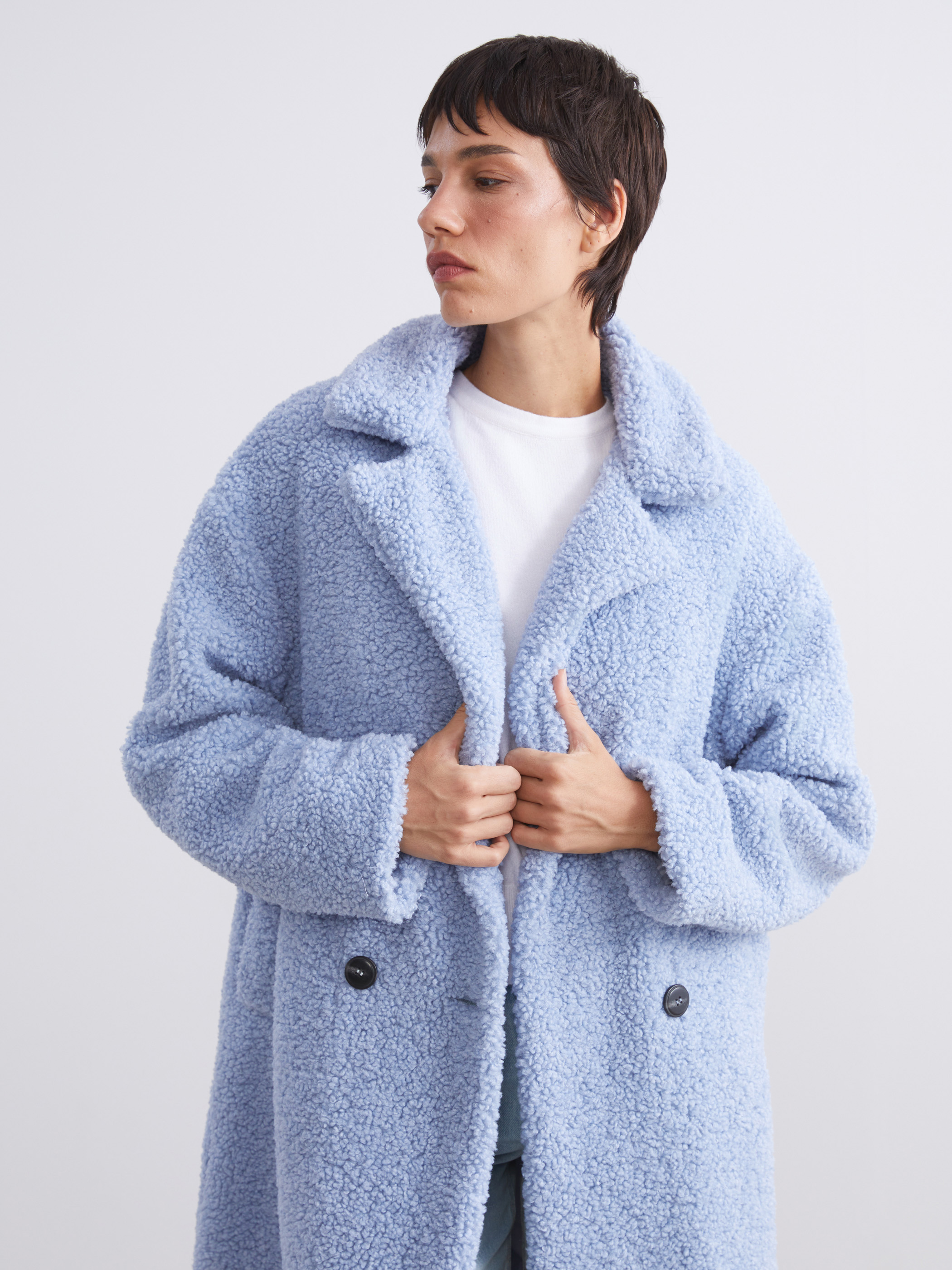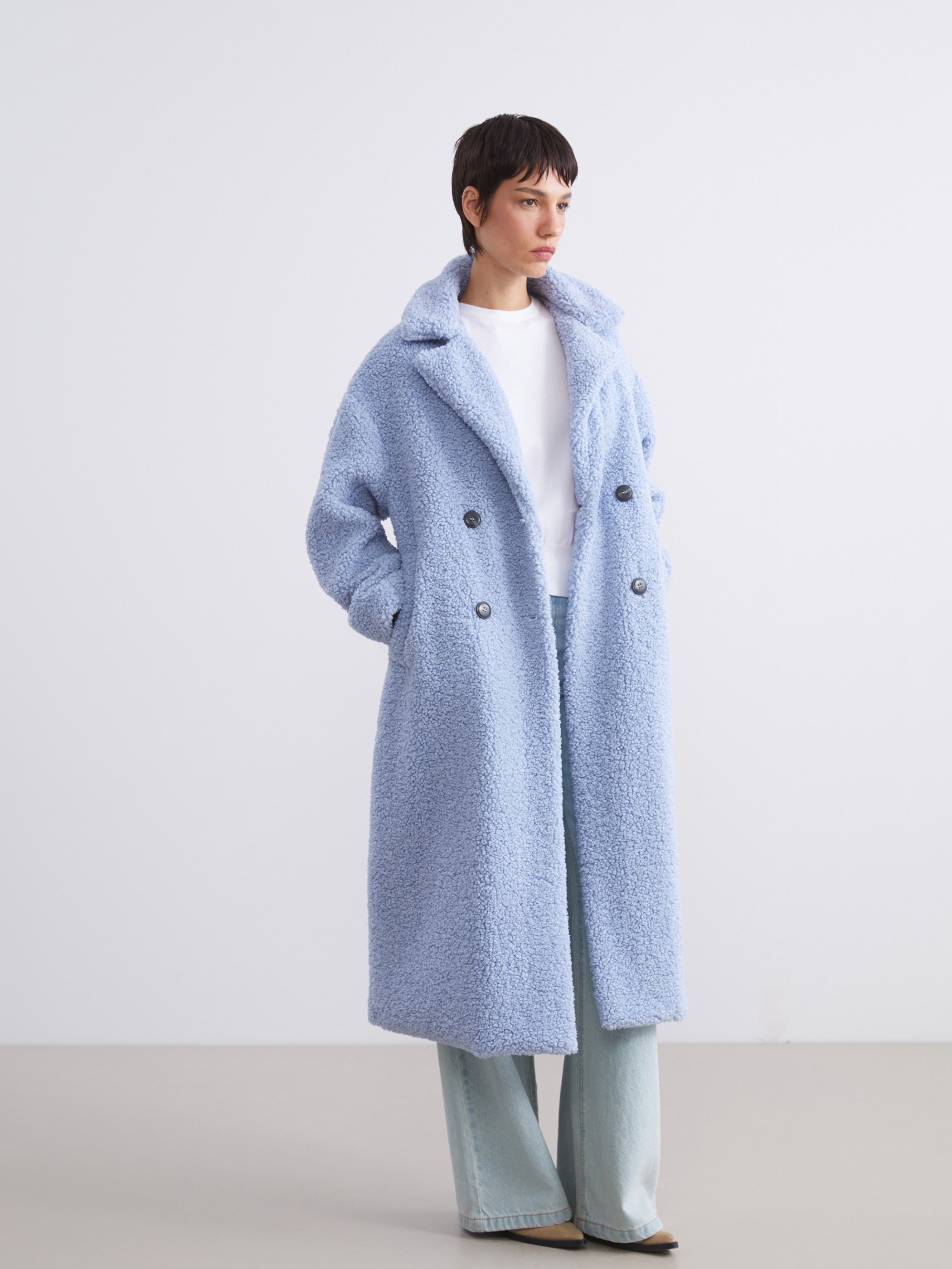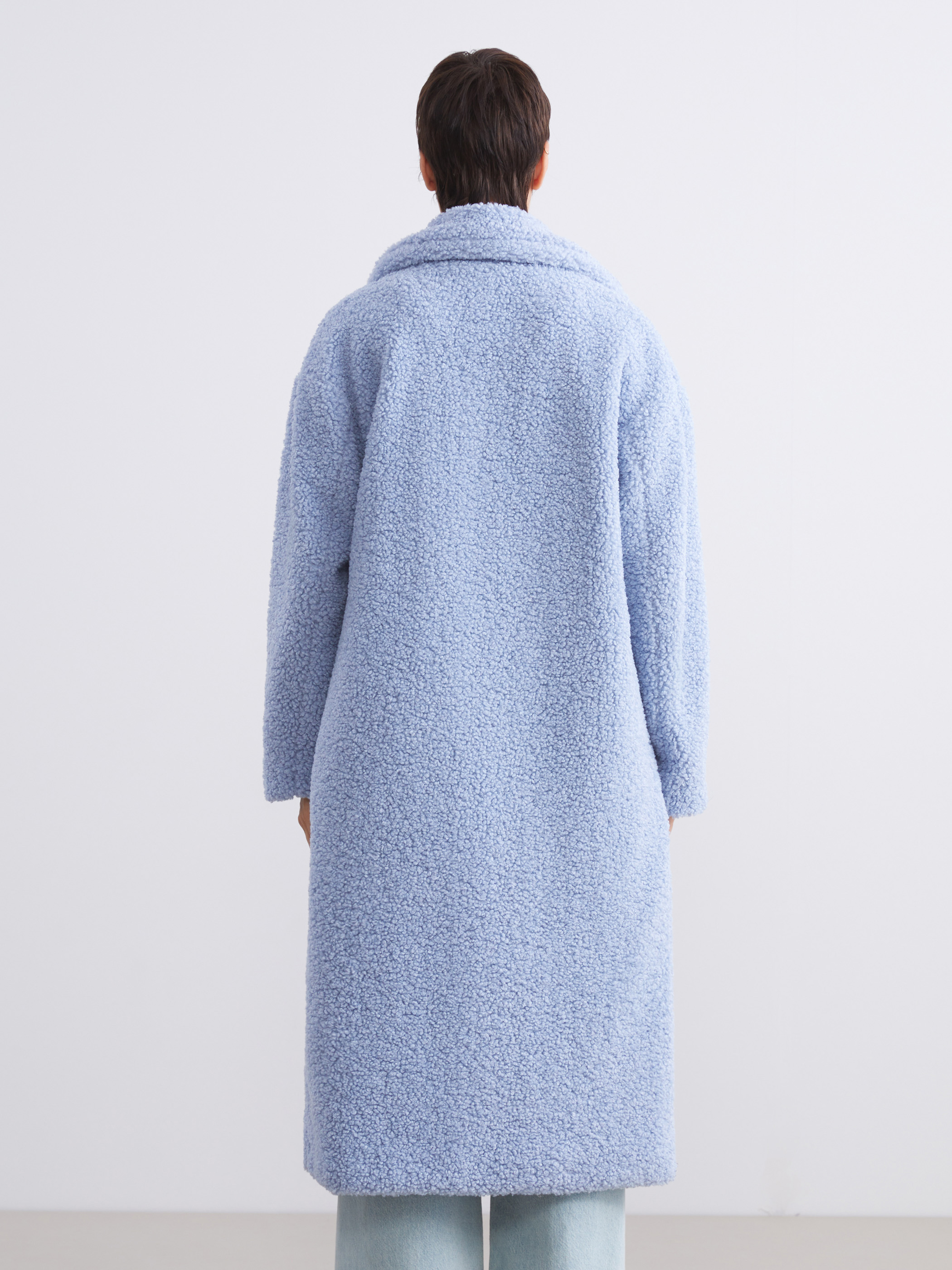 Ceket yaka, uzun kollu kadın peluş kaban. Önü kruvaze ve düğme kapamalıdır, yanlarda cepleri bulunur.