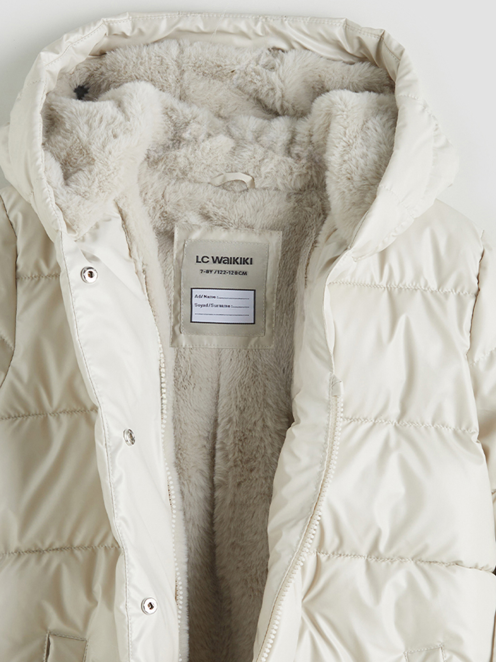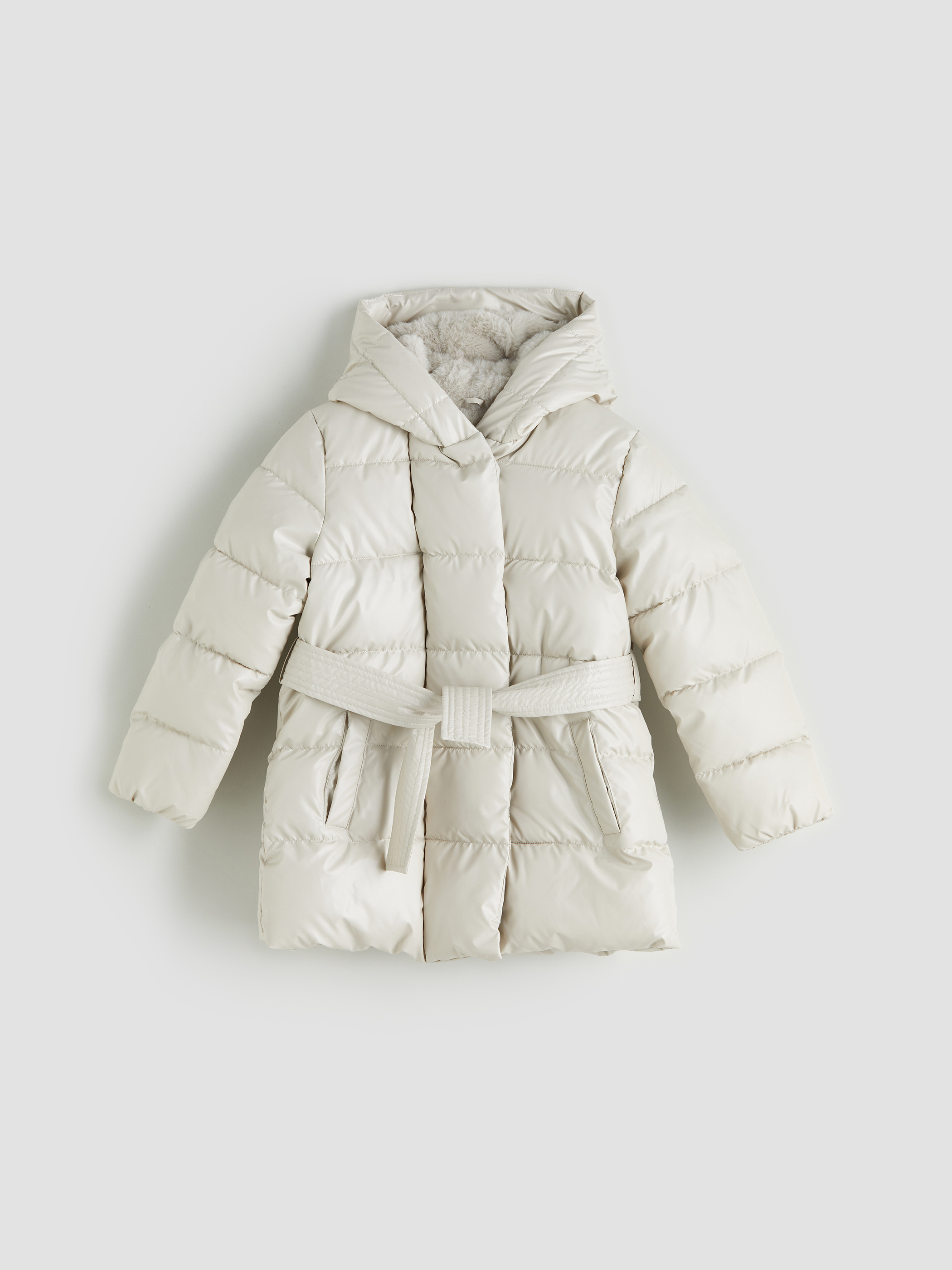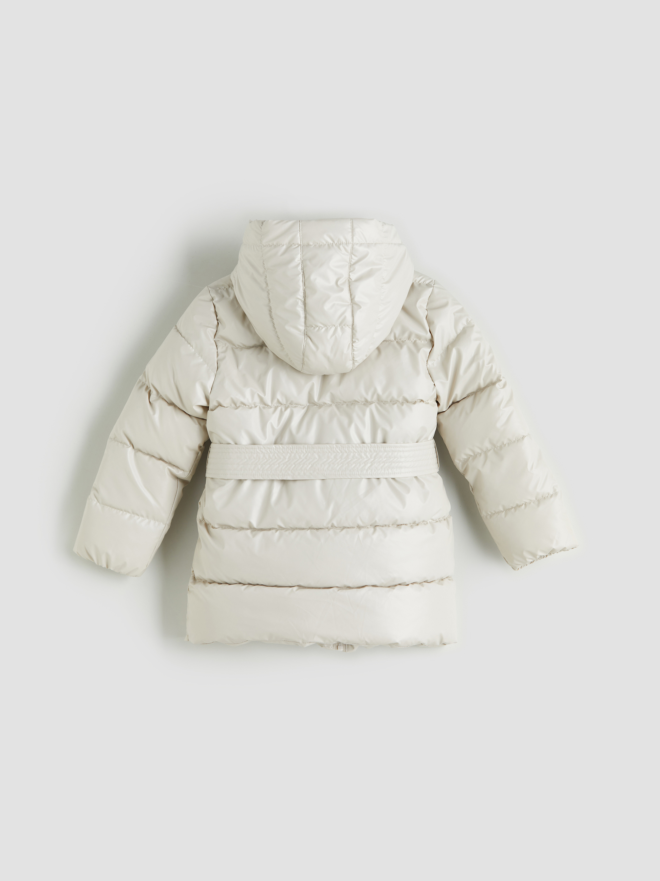 Kapüşonlu kız çocuk mont, su itici kumaştan üretilmiştir. İç kısmı pelüş astarlı ve kuşak detaylıdır.