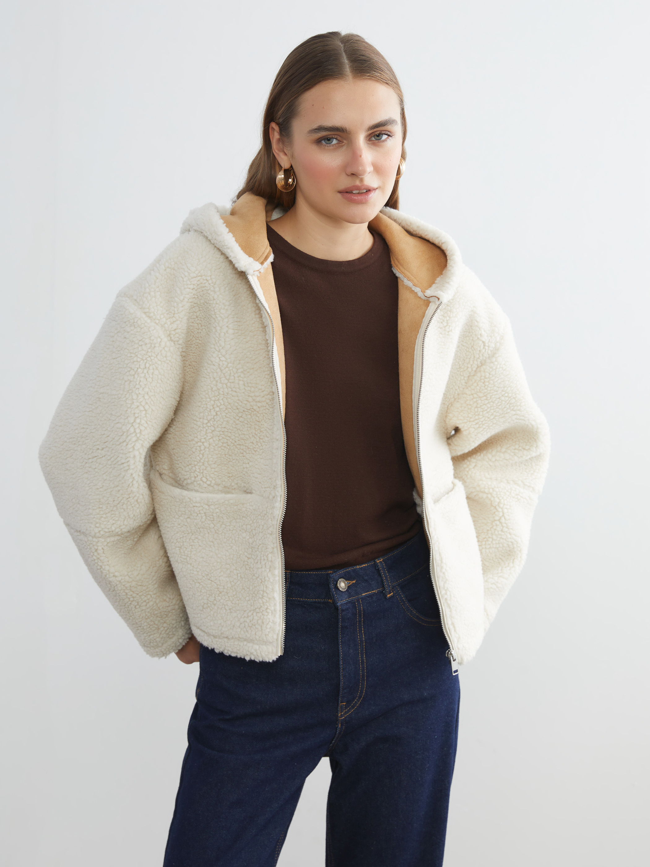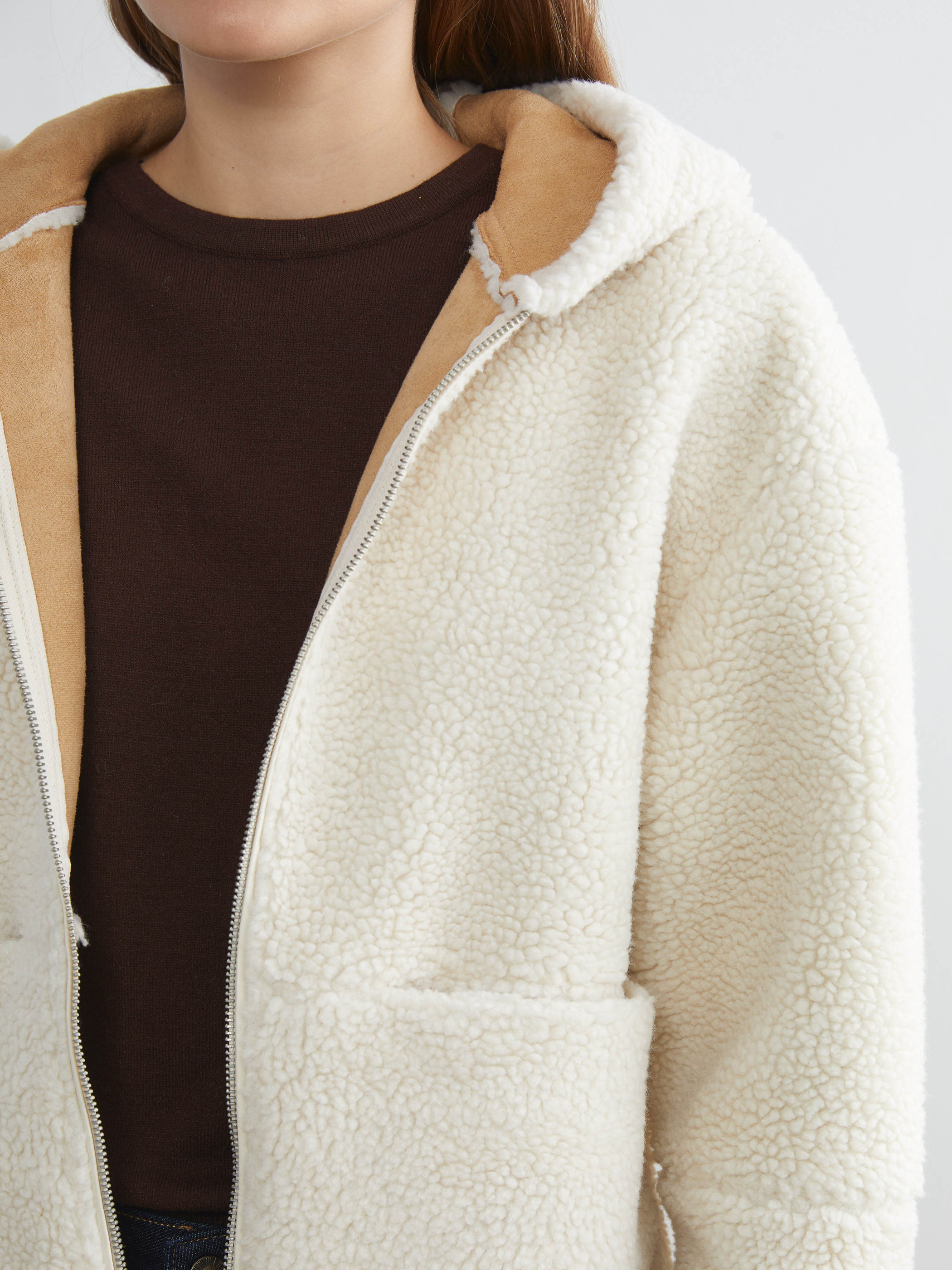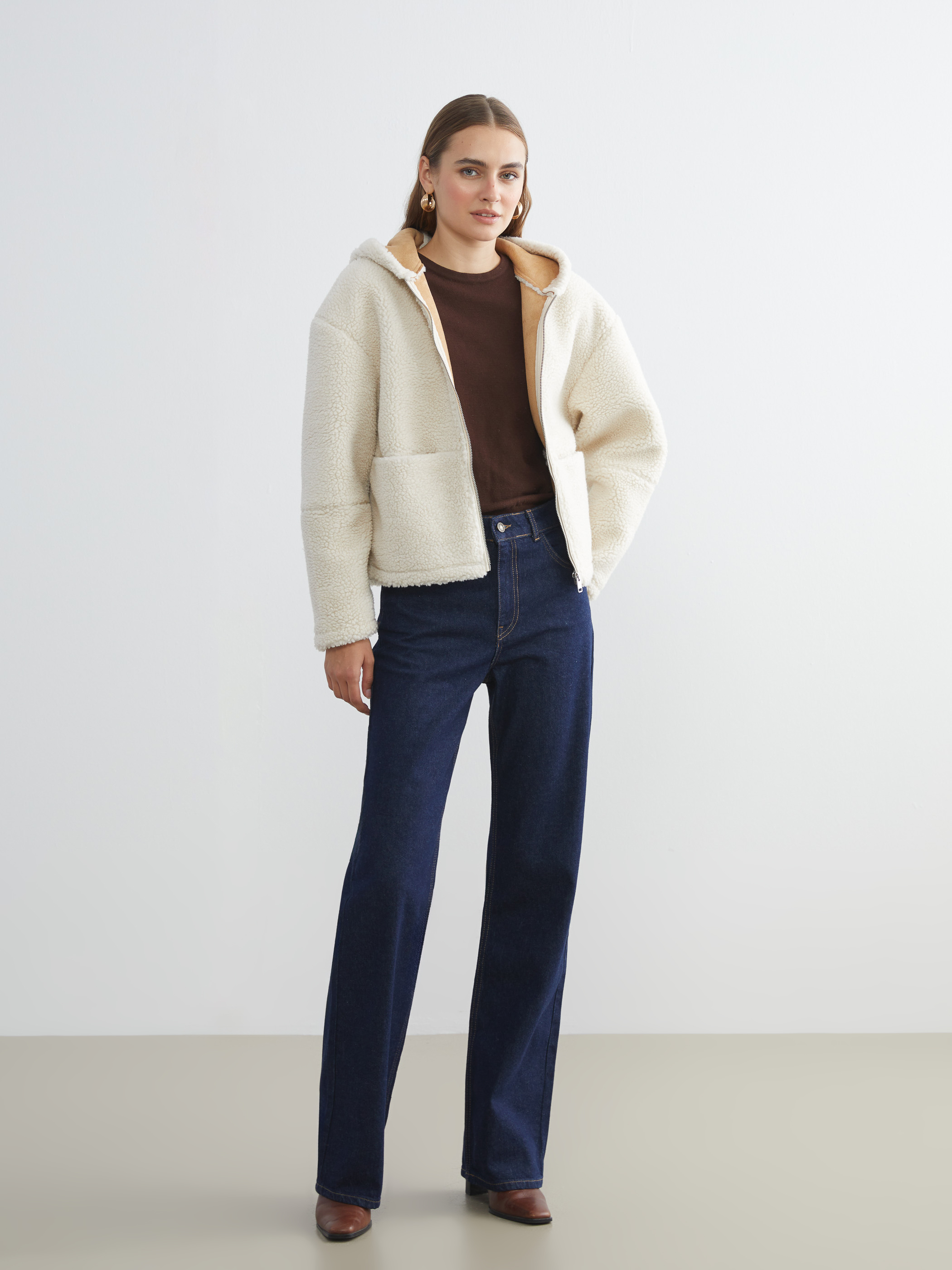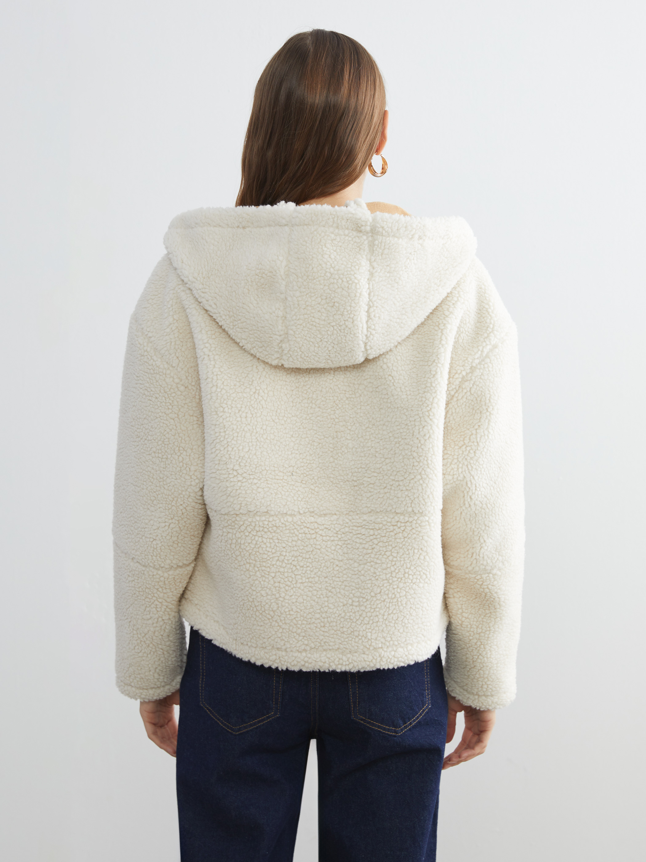 Pelüş, sabit kapüşonlu kadın mont, fermuar kapamalıdır. Uzun kollu ve önünde iki adet yama cebi bulunur.