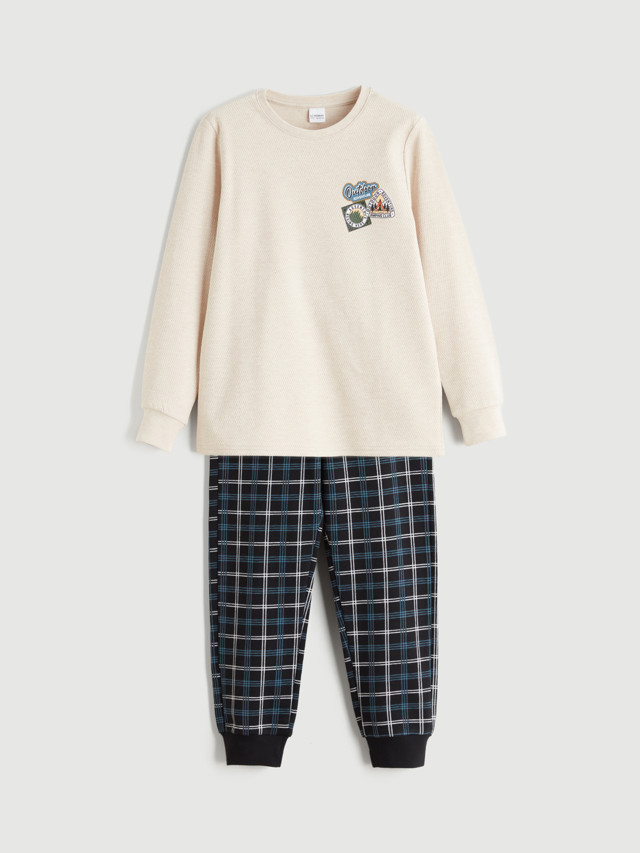 Baskılı pijama takımı, pamuklu kumaştan üretilmiştir. Pijama üst bisiklet yaka ve uzun kolludur. Pijama alt lastikli bel yapısına sahiptir.