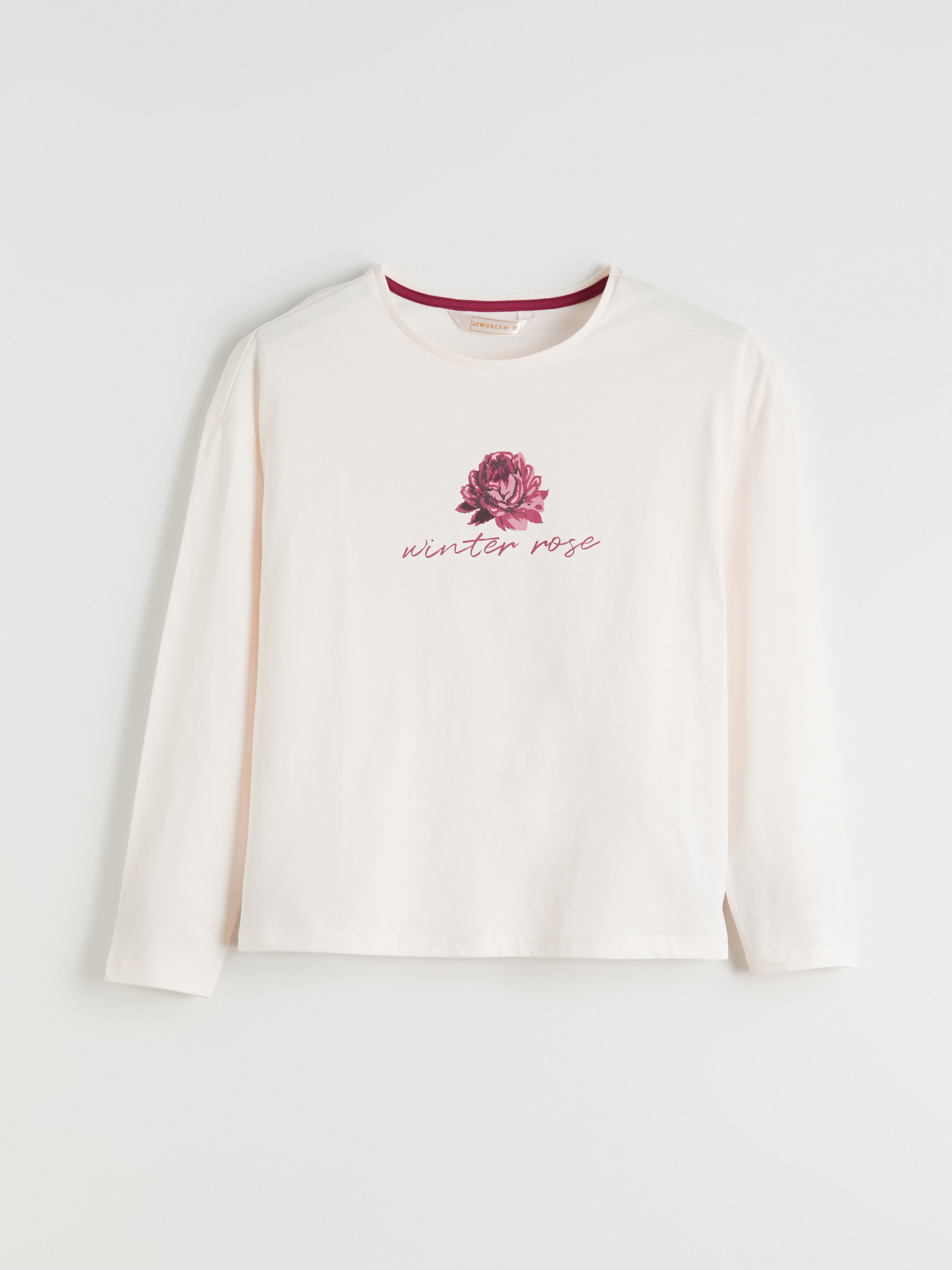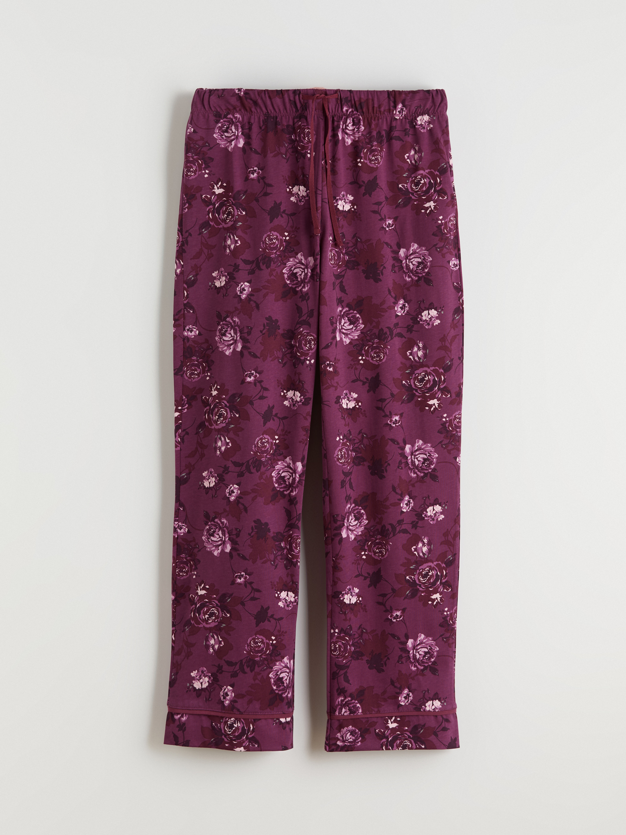 Penye kumaştan kadın pijama takımı; bisiklet yaka, uzun kollu üst ve beli lastikli, geniş paçalı alttan oluşmaktadır.