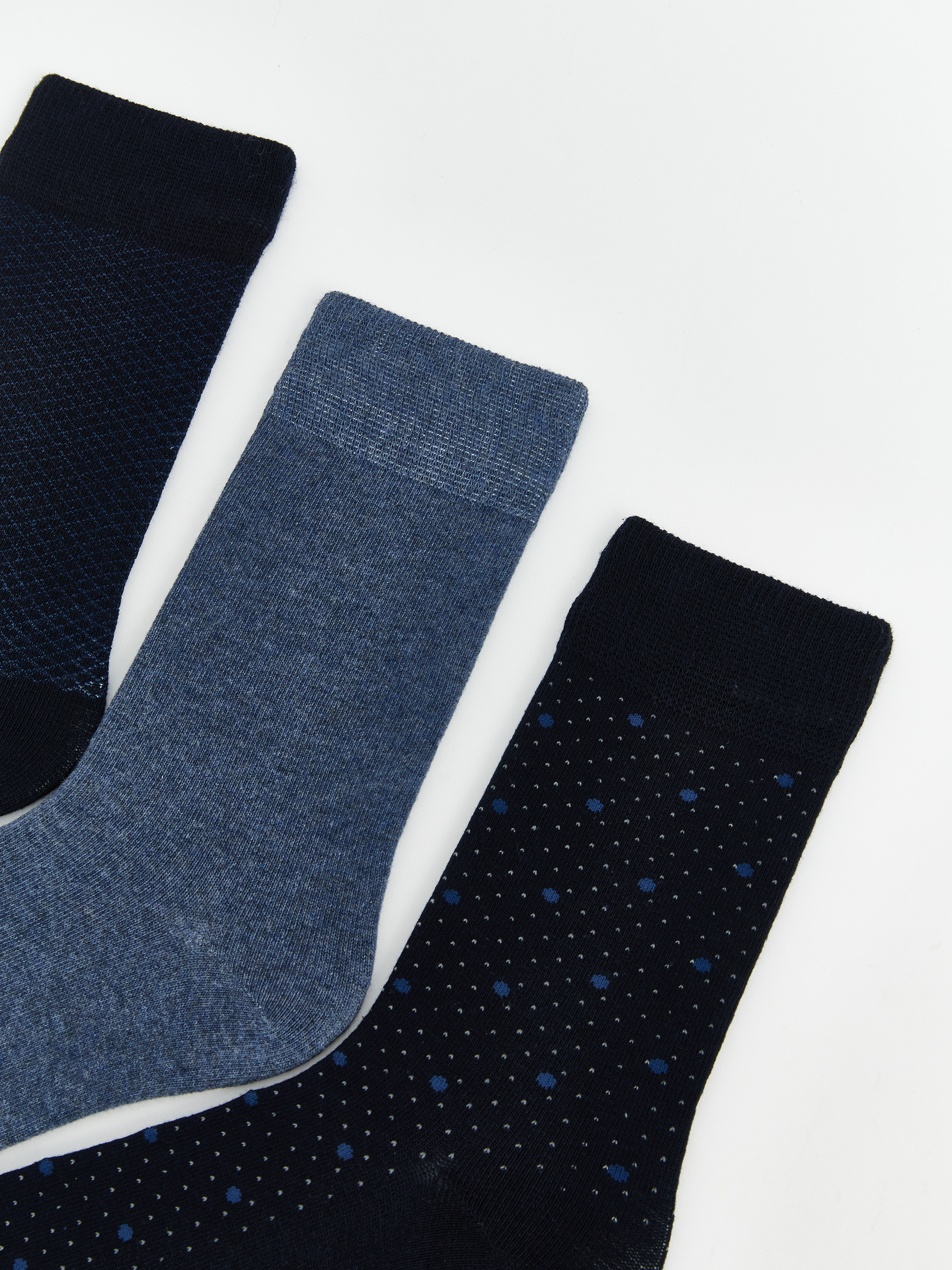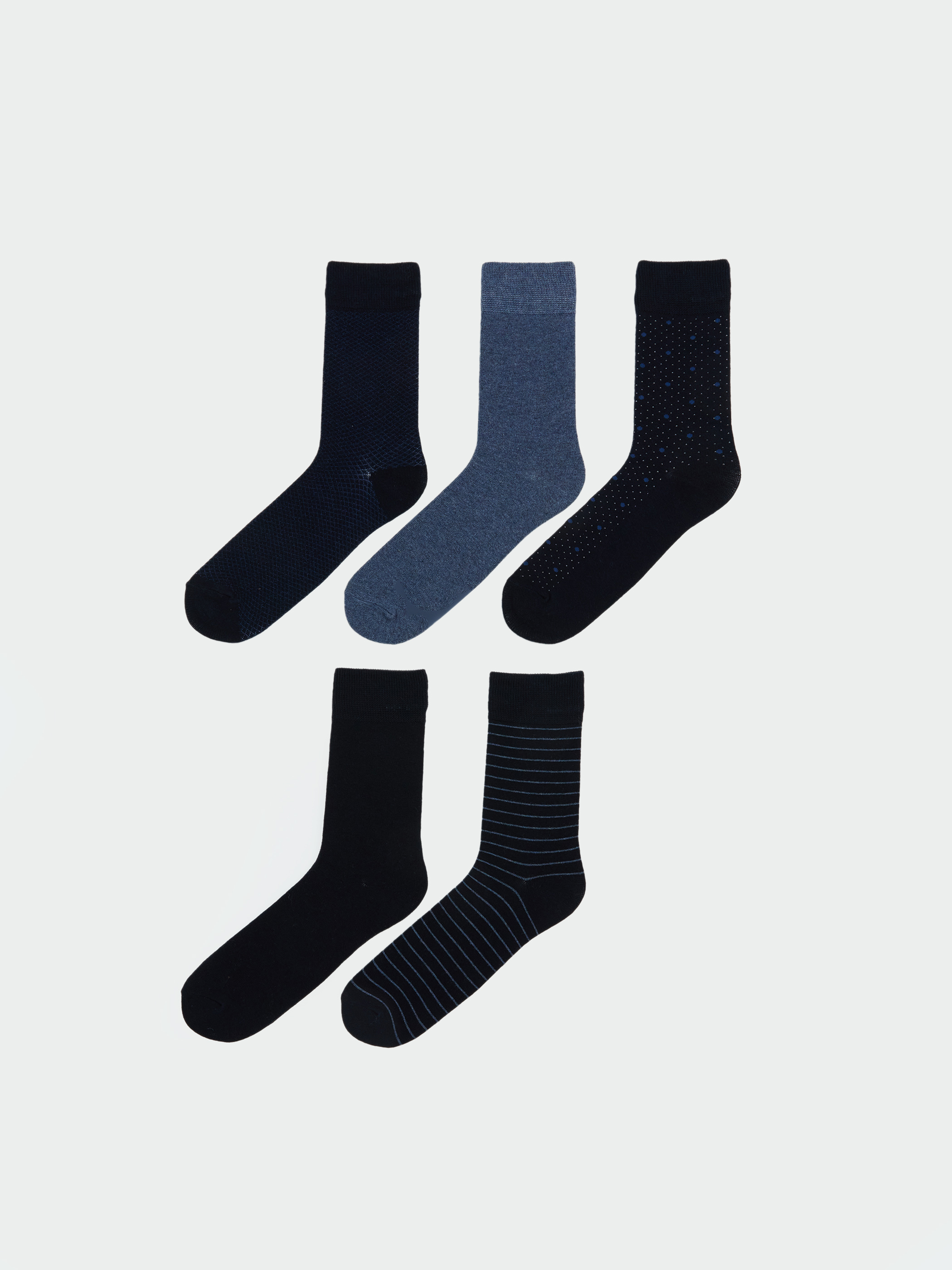 Çizgili desenli pamuk karışımlı esnek kumaştan üretilmiş erkek soket çorap, beşli paket şeklinde sunulmuştur.