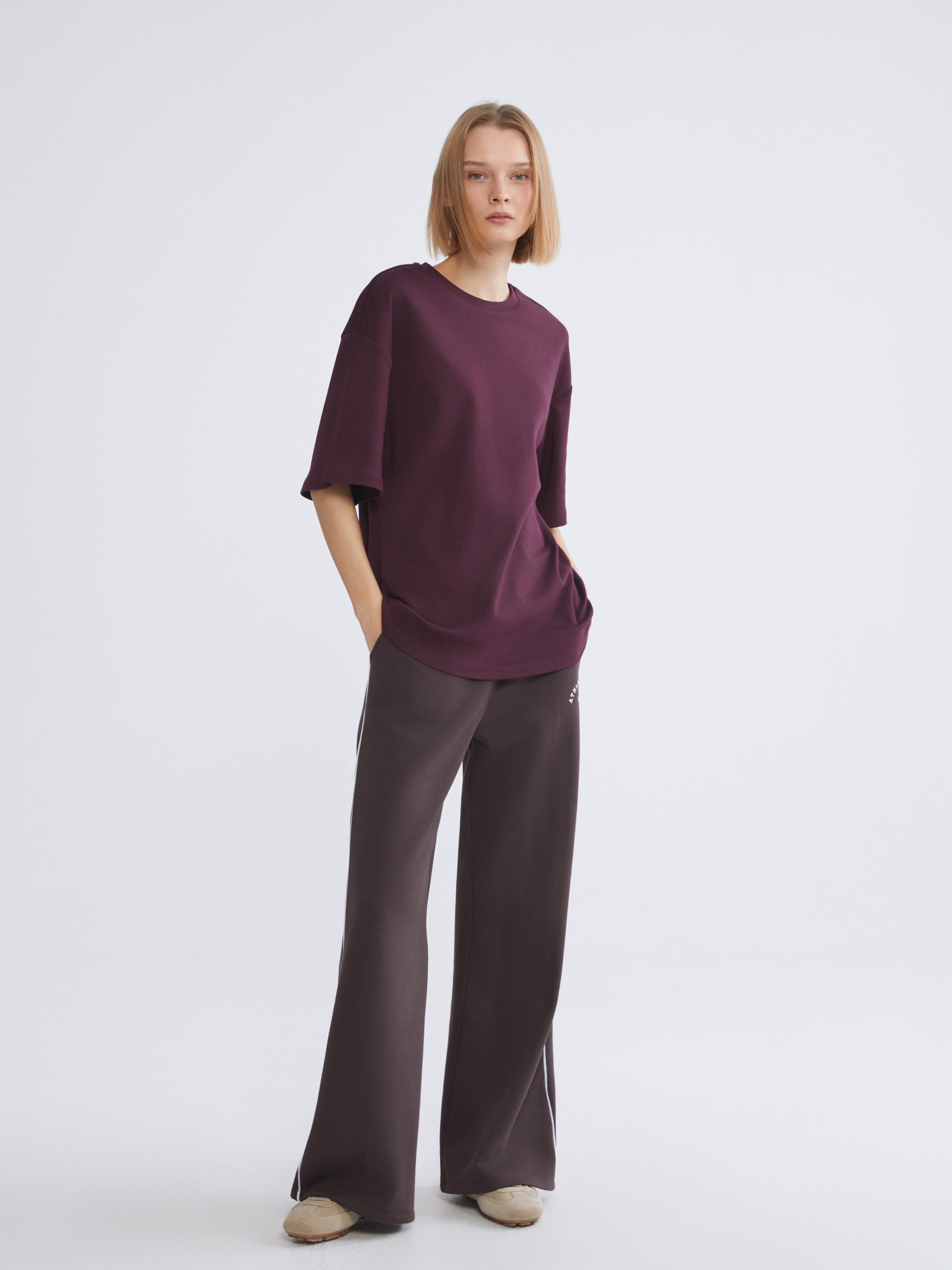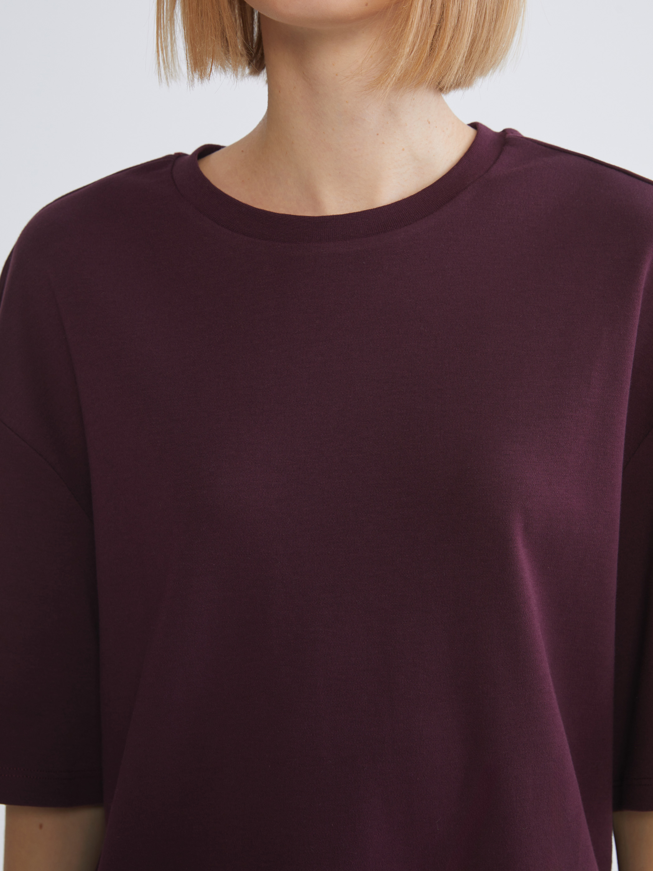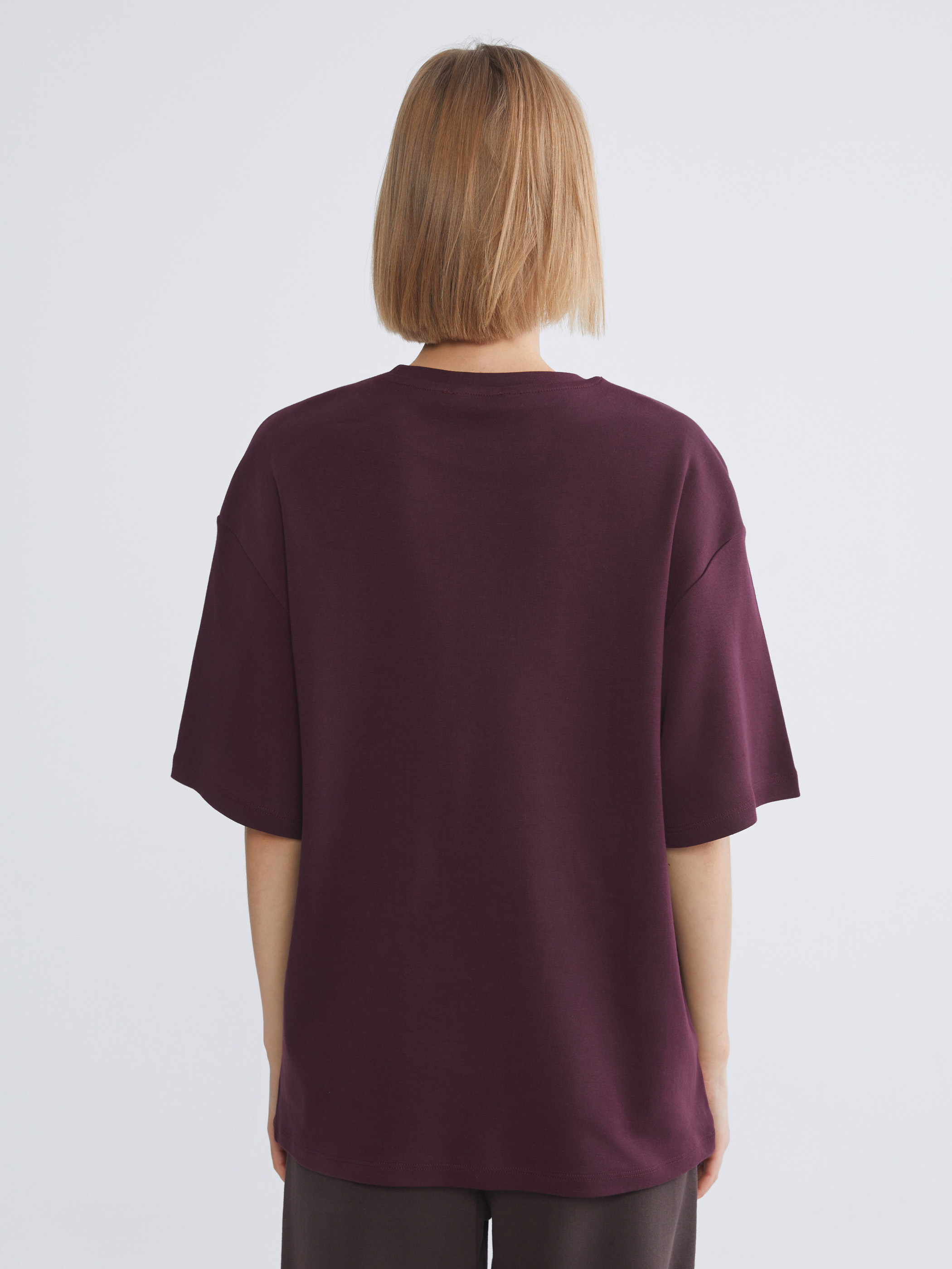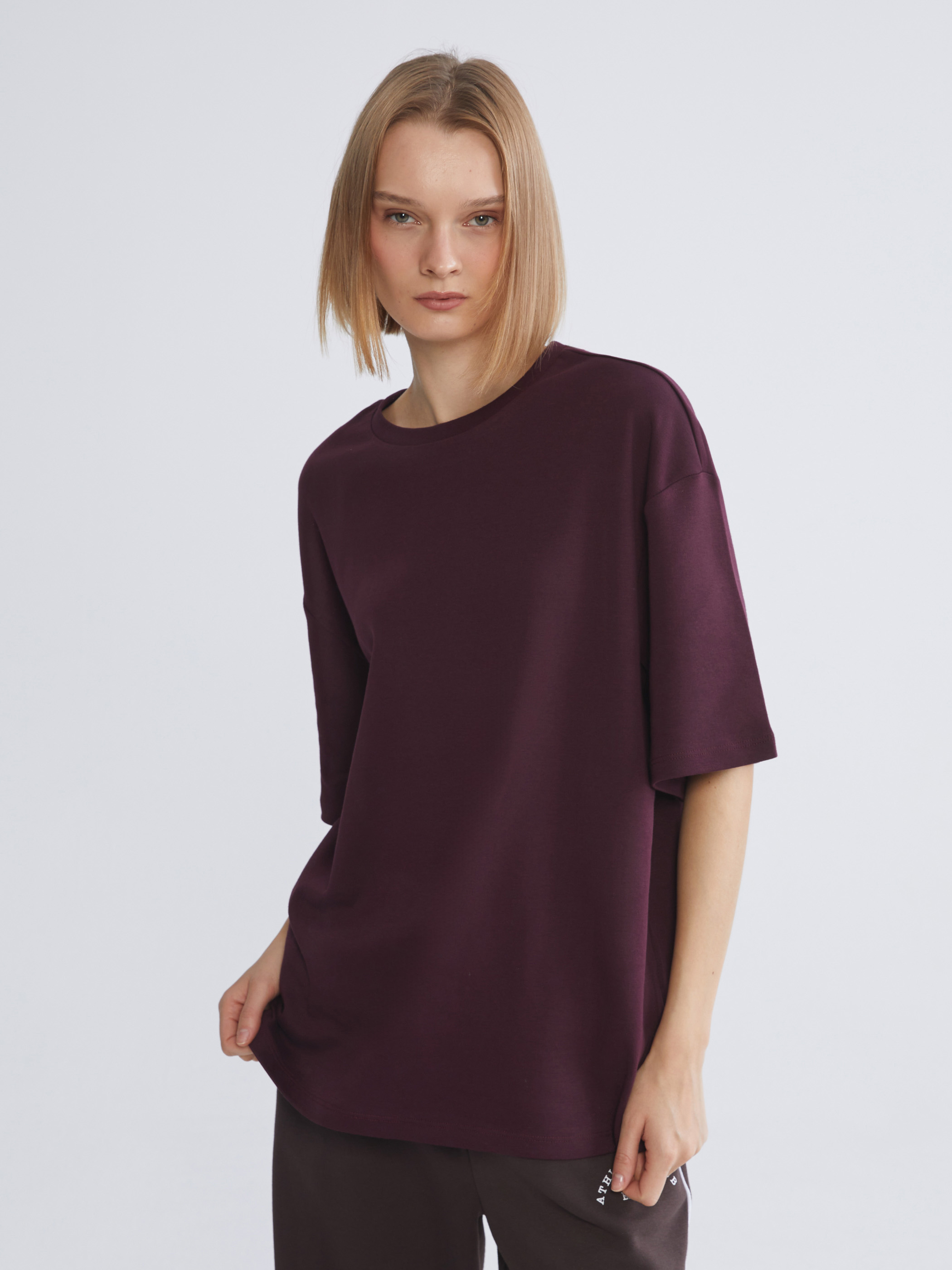 Bisiklet yaka kadın tişört, interlok kumaştan üretilmiştir. Oversize kesime sahiptir.