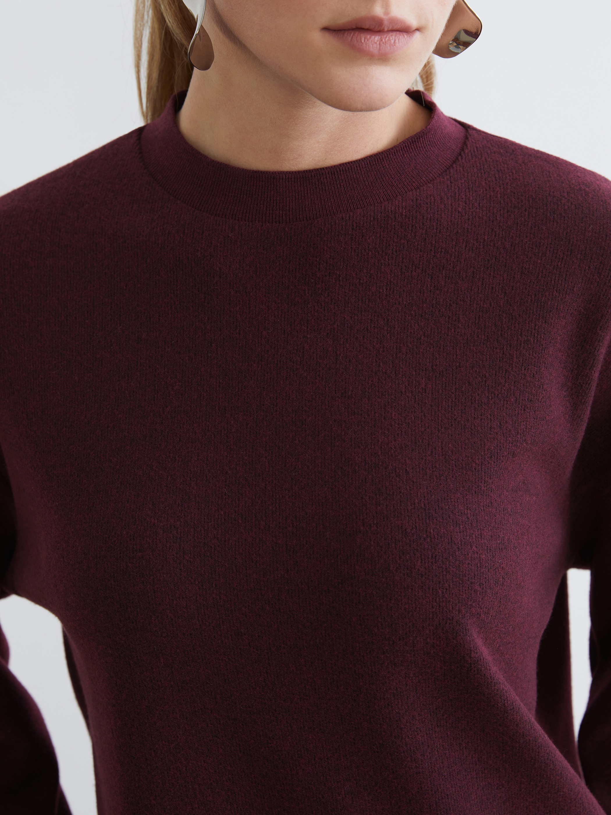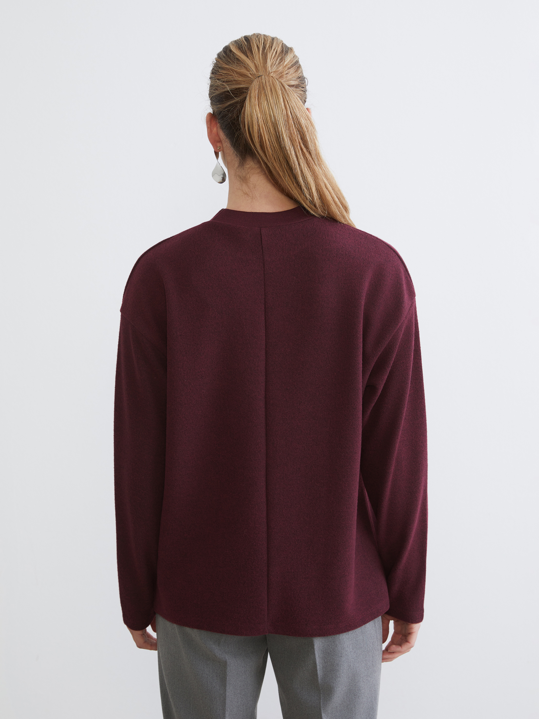 Dik yakalı ve uzun kollu kadın tişört, düz ve desensiz kumaştan üretilmiştir ve oversize kalıplıdır.