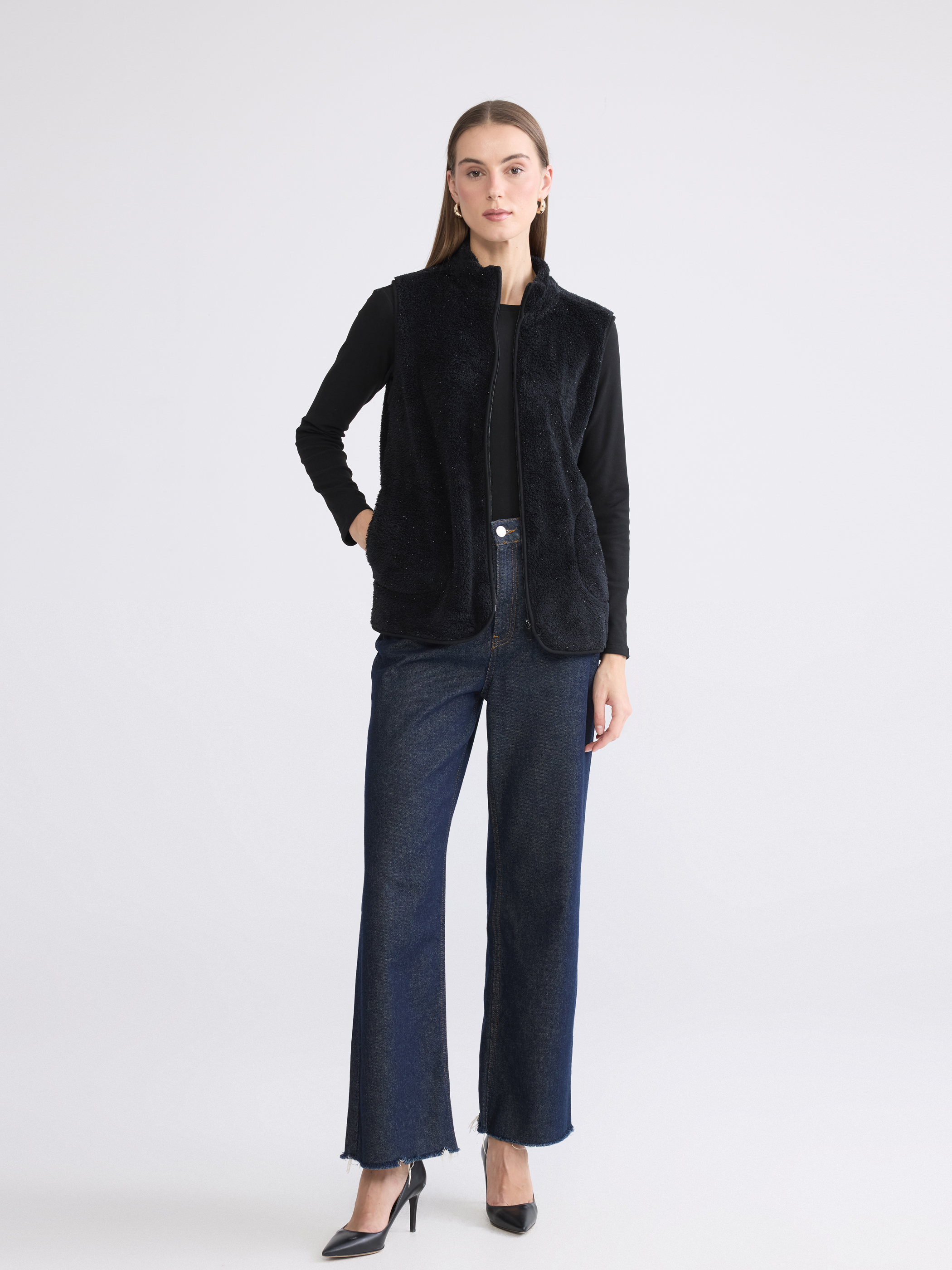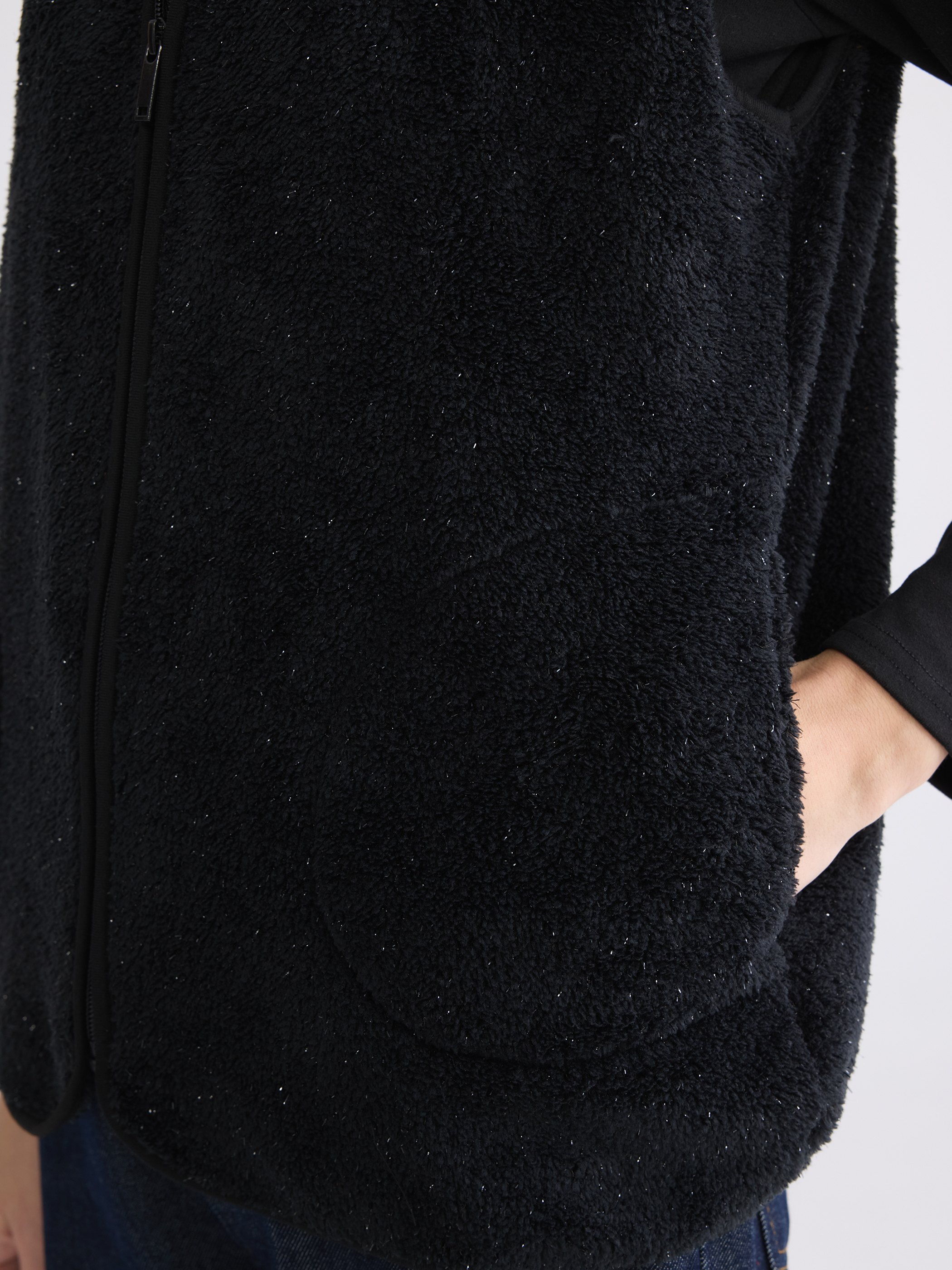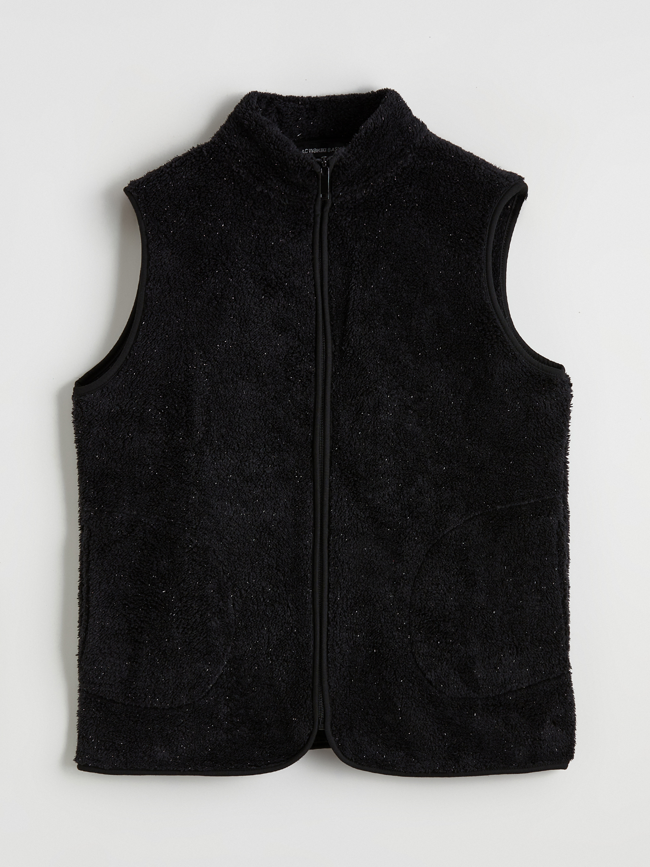Dik yaka kadın yelek, polar kumaştan üretilmiştir. Fermuar kapamalı tasarıma sahiptir.